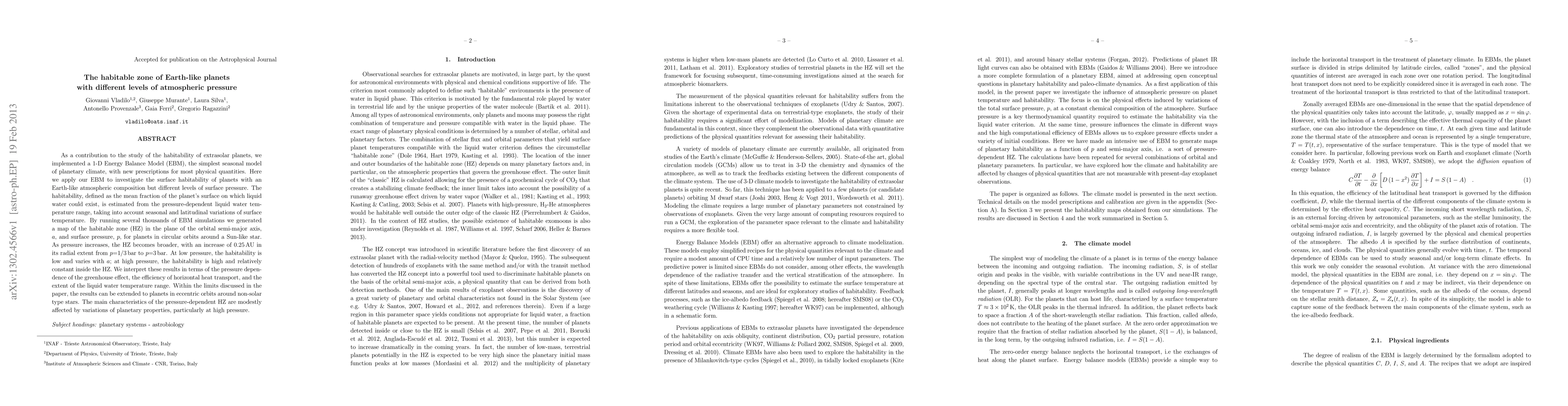 This study uses a 1-D Energy Balance Model to map the habitable zone of Earth-like planets with varying atmospheric pressures, finding that higher pressures broaden the habitable zone by 0.25 AU. The habitability is high and stable at high pressures but low and variable at low pressures, influenced by the greenhouse effect and heat transport.