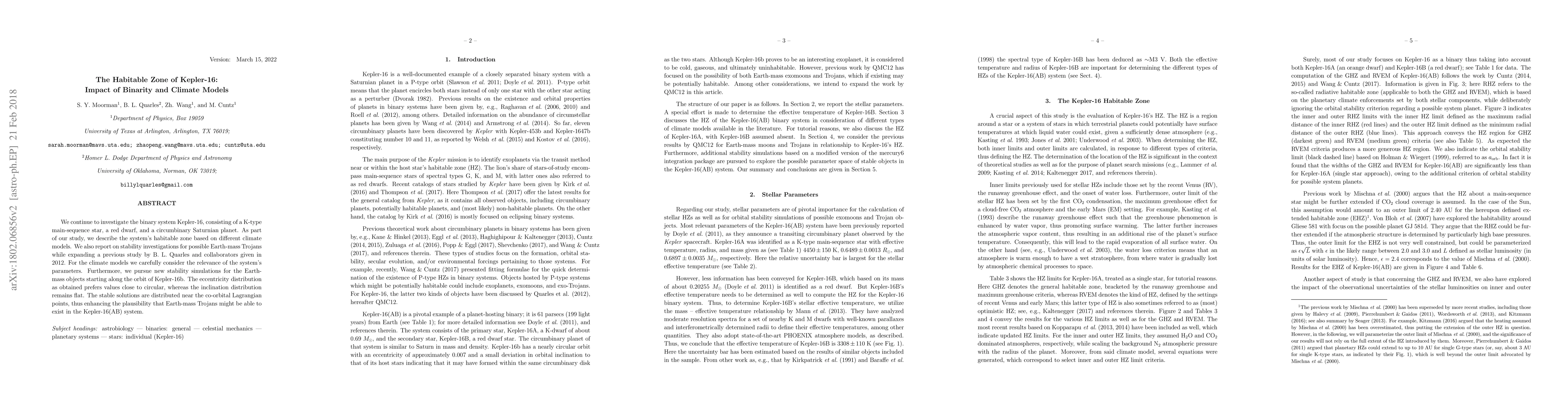 We continue to investigate the binary system Kepler-16, consisting of a K-type main-sequence star, a red dwarf, and a circumbinary Saturnian planet. As part of our study, we describe the system's habitable zone based on different climate models. We also report on stability investigations for possible Earth-mass Trojans while expanding a previous study by B. L. Quarles and collaborators given in 2012. For the climate models we carefully consider the relevance of the system's parameters. Furthermore, we pursue new stability simulations for the Earth-mass objects starting along the orbit of Kepler-16b. The eccentricity distribution as obtained prefers values close to circular, whereas the inclination distribution remains flat. The stable solutions are distributed near the co-orbital Lagrangian points, thus enhancing the plausibility that Earth-mass Trojans might be able to exist in the Kepler-16(AB) system.