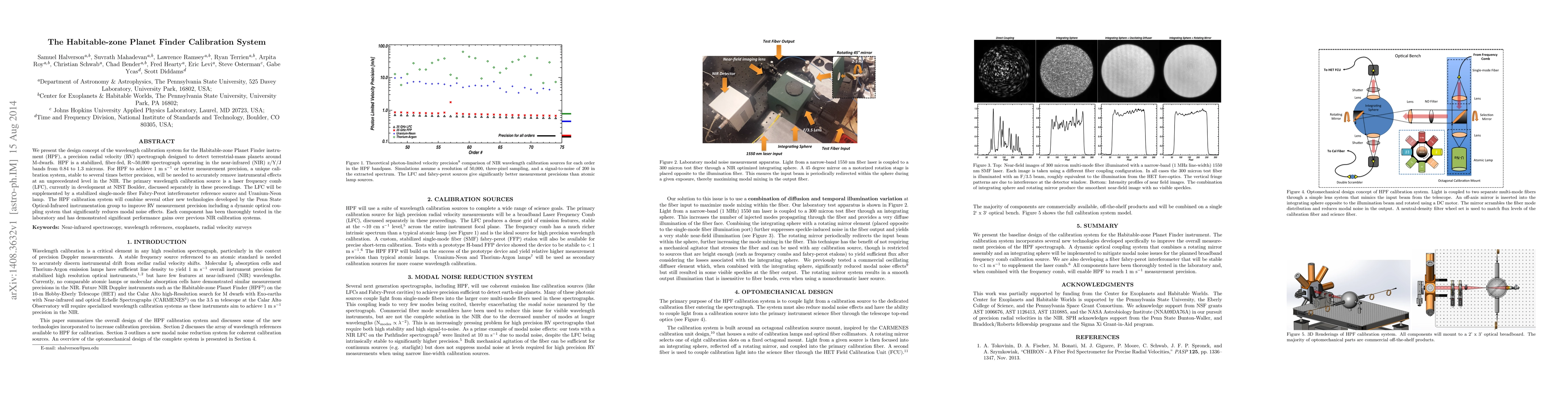 The Habitable-zone Planet Finder Calibration System aims to achieve high precision in radial velocity measurements for detecting terrestrial-mass planets around M-dwarfs using a laser frequency comb and other advanced technologies. The system's design focuses on unprecedented stability and accuracy in the near-infrared spectrum.