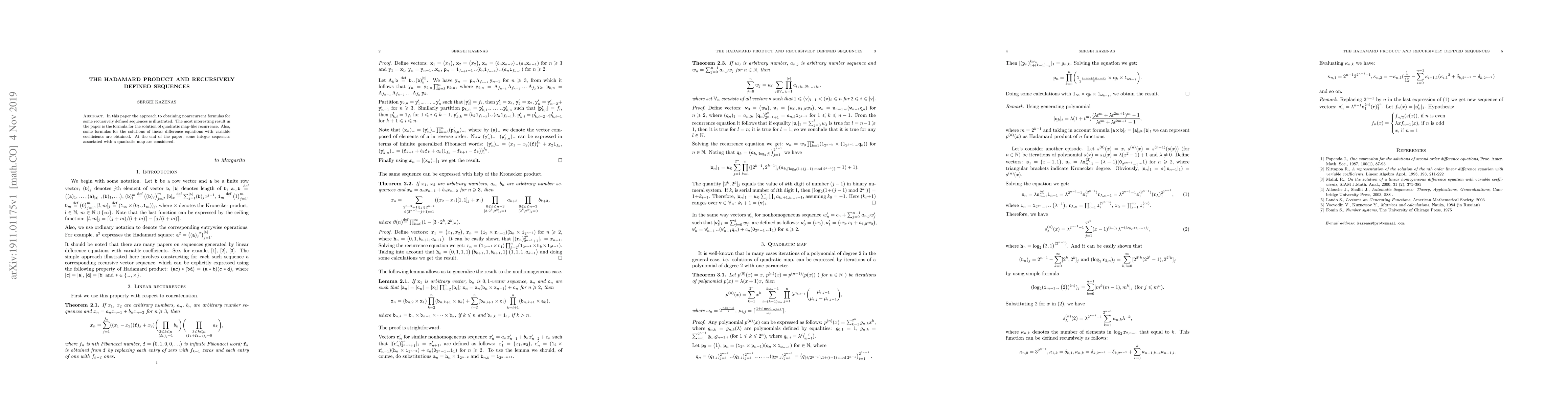 In this paper the approach to obtaining nonrecurrent formulas for some recursively defined sequences is illustrated. The most interesting result in the paper is the formula for the solution of quadratic map-like recurrence. Also, some formulas for the solutions of linear difference equations with variable coefficients are obtained. At the end of the paper, some integer sequences associated with a quadratic map are considered.