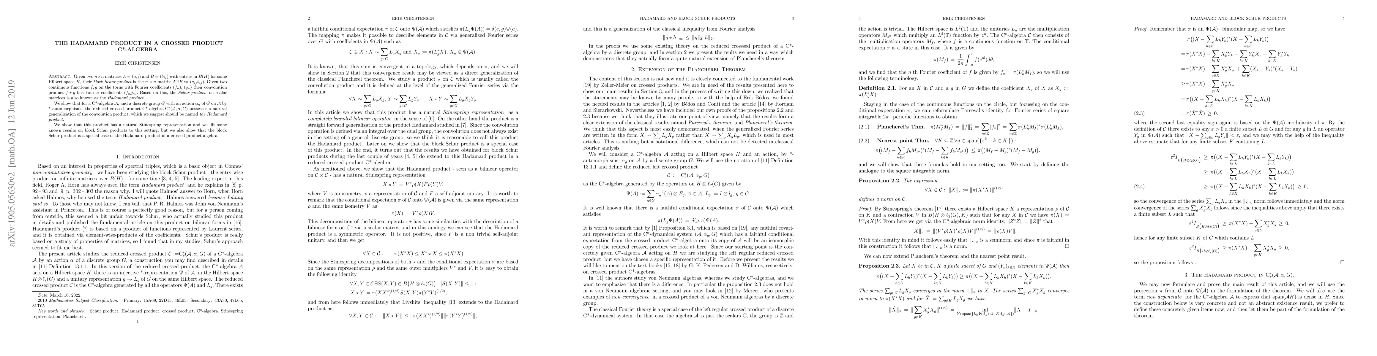 This paper introduces the Hadamard product as a natural generalization of the convolution product in the reduced crossed product C*-algebra of a C*-algebra A acted upon by a discrete group G. It demonstrates that this product has a Stinespring representation and extends known results on block Schur products to this context.