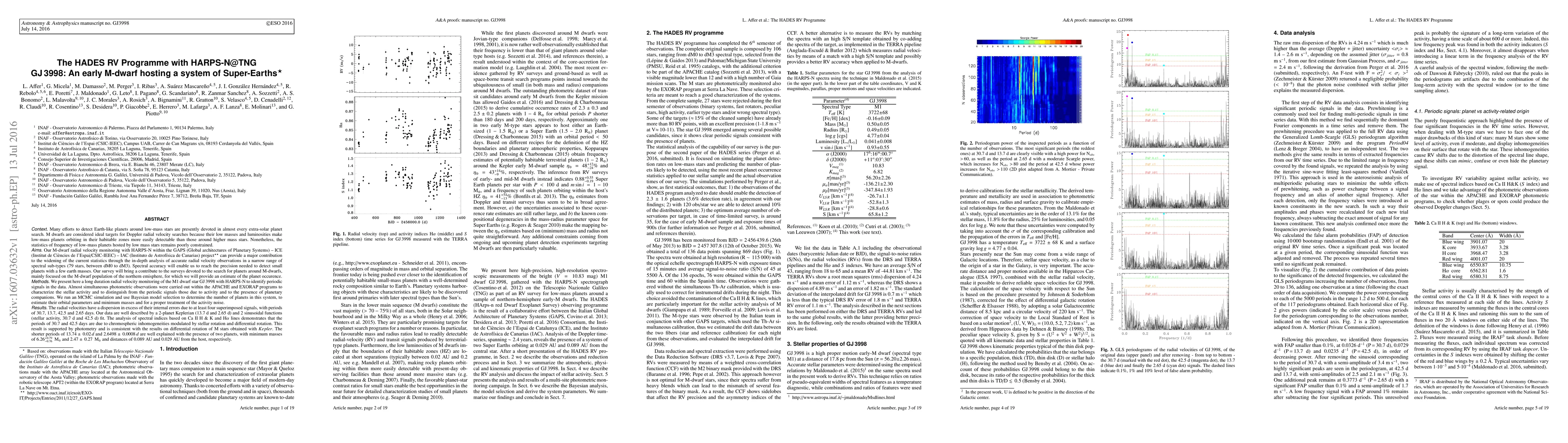 The HADES RV Programme with HARPS-N@TNG identified two Super-Earths orbiting the M1 dwarf GJ 3998, with minimum masses of 6.26 MEarth and 2.47 MEarth, respectively, distinguishing them from stellar activity through radial velocity and photometric observations. This study enhances the statistics of low-mass planets around M-dwarfs.