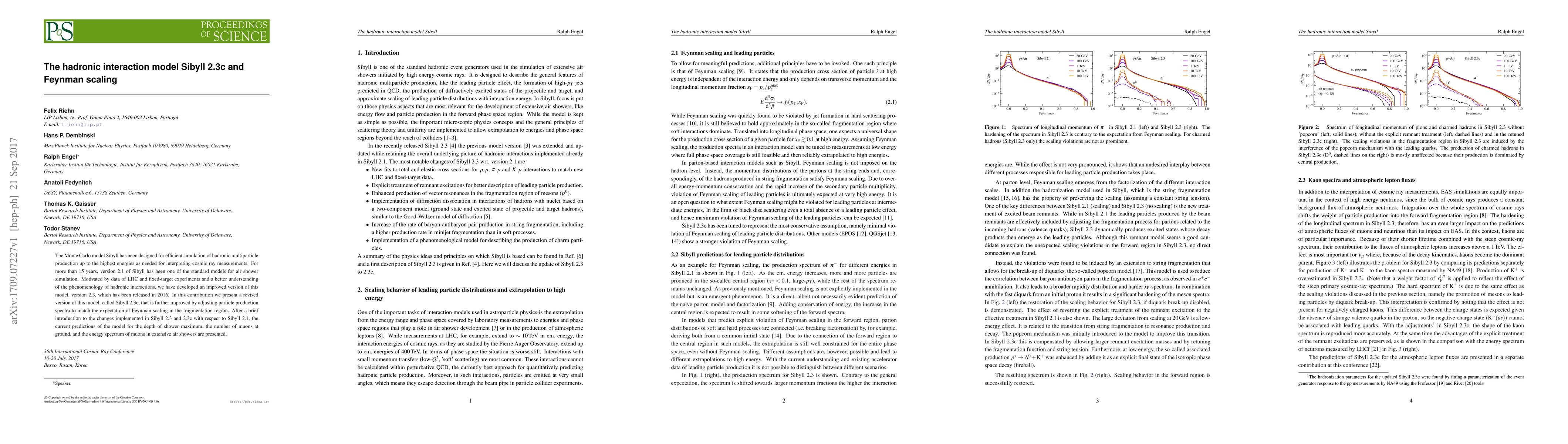 A revised version of the Sibyll 2.3c hadronic interaction model improves particle production spectra to match Feynman scaling, enhancing air shower simulation accuracy for cosmic ray measurements.