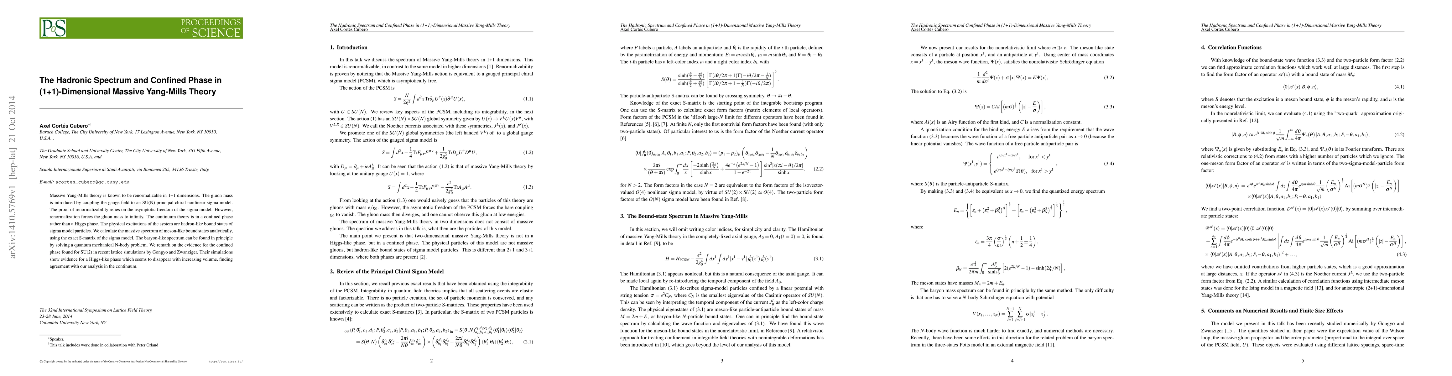 Massive Yang-Mills theory is known to be renormalizable in 1+1 dimensions. The gluon mass is introduced by coupling the gauge field to an SU(N) principal chiral nonlinear sigma model. The proof of renormalizability relies on the asymptotic freedom of the sigma model. However, renormalization forces the gluon mass to infinity. The continuum theory is in a confined phase rather than a Higgs phase. The physical excitations of the system are hadron-like bound states of sigma model particles. We calculate the massive spectrum of meson-like bound states analytically, using the exact S-matrix of the sigma model. The baryon-like spectrum can be found in principle by solving a quantum mechanical N-body problem. We remark on the evidence for the confined phase found for SU(2) in recent lattice simulations by Gongyo and Zwanziger. Their simulations show evidence for a Higgs-like phase which seems to disappear with increasing volume, finding agreement with our analysis in the continuum.
