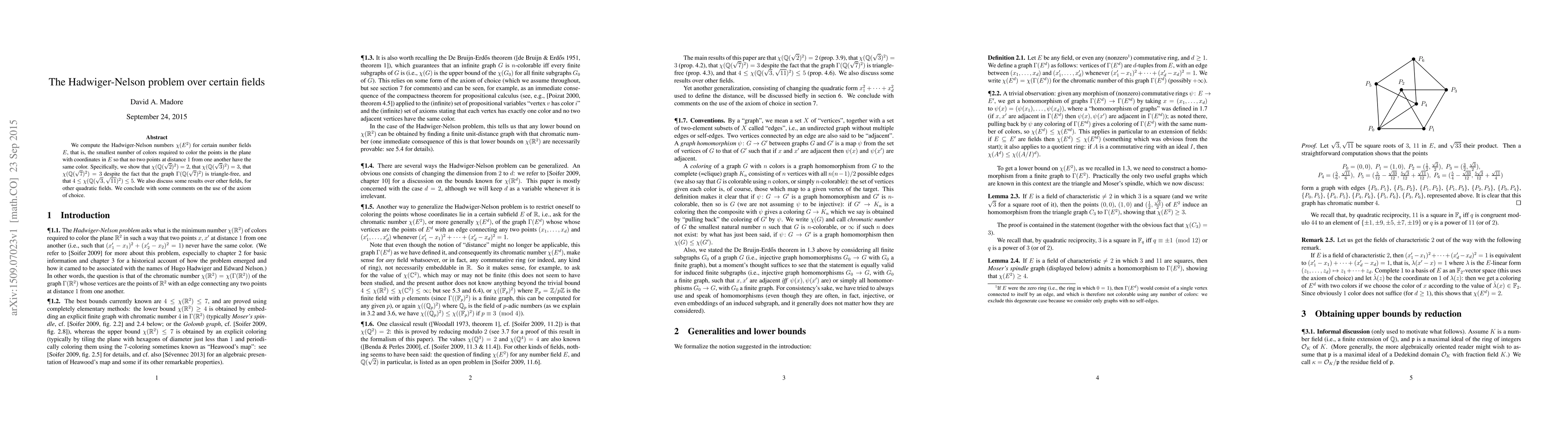 This paper determines the Hadwiger-Nelson chromatic numbers for colorings of points in the plane with coordinates in specific number fields, finding that $\chi(\mathbb{Q}(\sqrt{2})^2) = 2$, $\chi(\mathbb{Q}(\sqrt{3})^2) = 3$, $\chi(\mathbb{Q}(\sqrt{7})^2) = 3$ despite no triangles, and $4 \leq \chi(\mathbb{Q}(\sqrt{3}, \sqrt{11})^2) \leq 5$. It also touches on other quadratic fields and the role of the axiom of choice.
