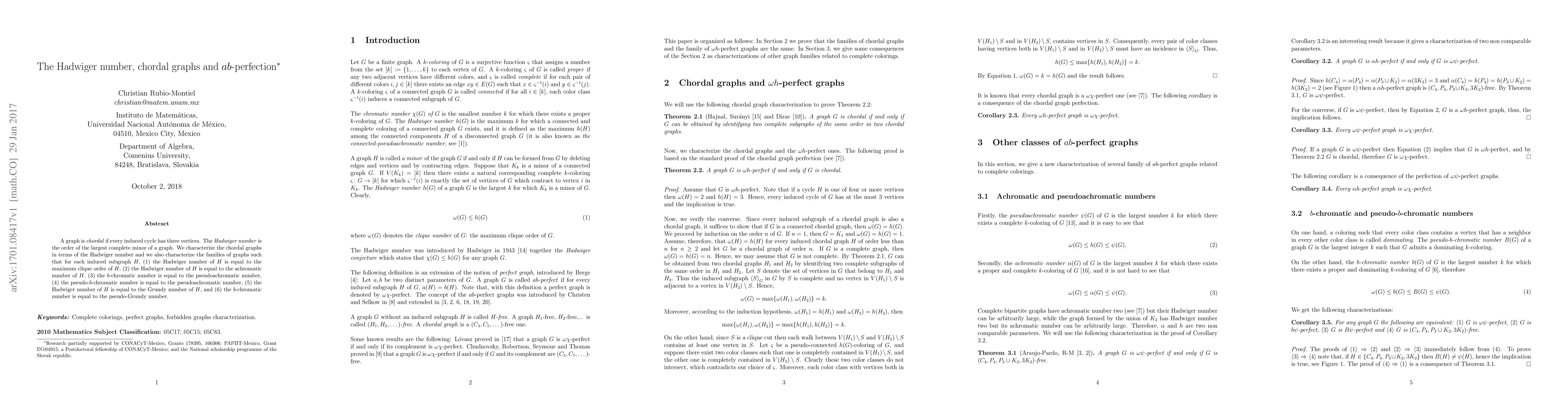 The paper uses graph theory concepts, specifically focusing on chordal graphs, Hadwiger numbers, and $ab$-perfection to characterize various graph families related to complete colorings.