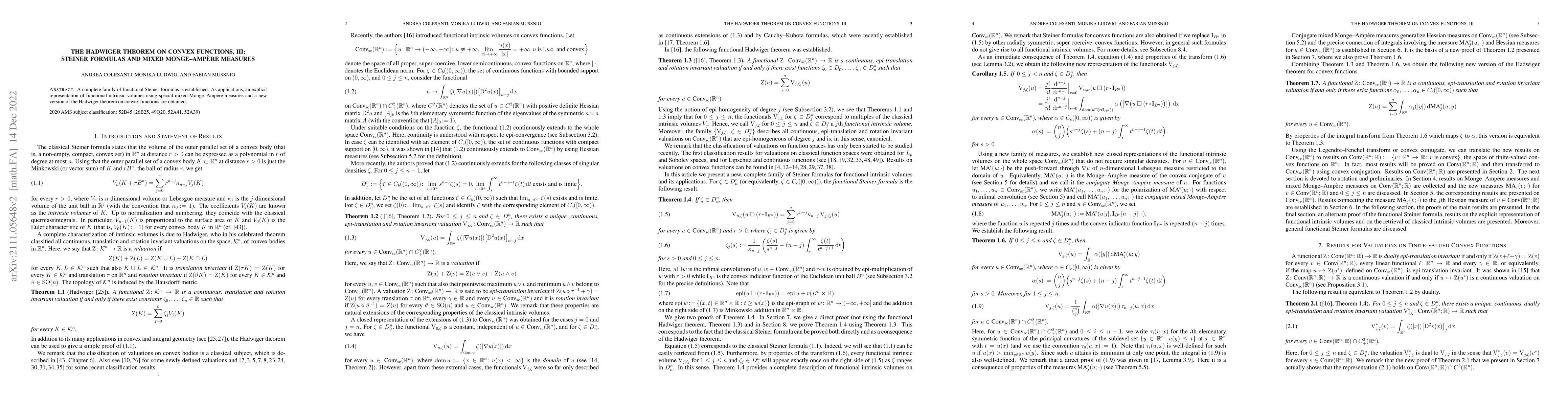 Summary: The paper develops a comprehensive set of functional Steiner formulas and uses them to explicitly represent intrinsic volumes through mixed Monge-Ampère measures, leading to a novel version of the Hadwiger theorem on convex functions.