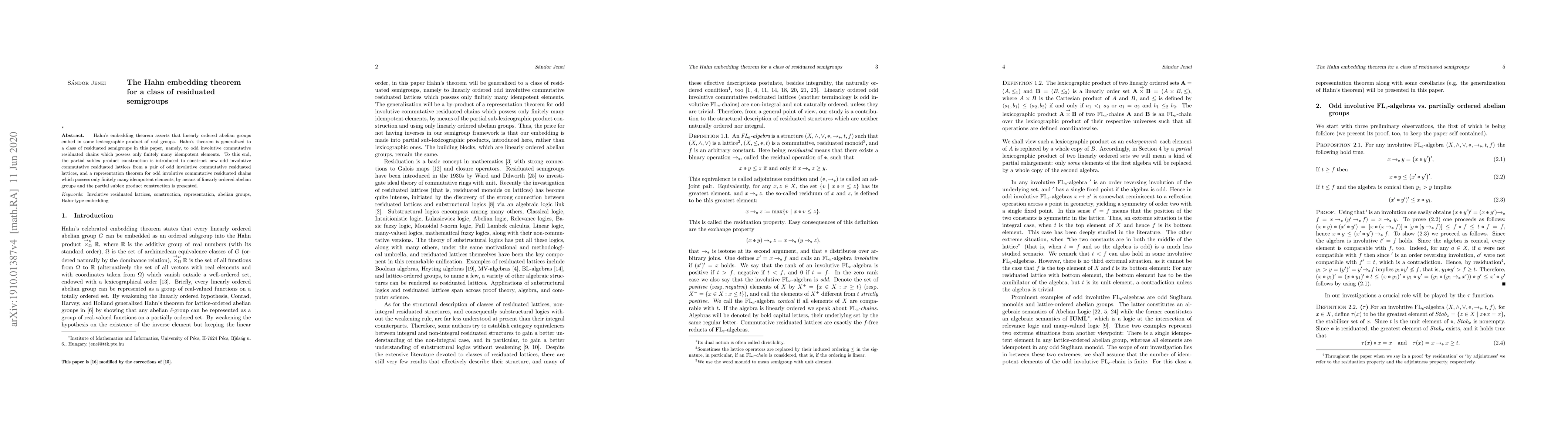 This paper generalizes Hahn's embedding theorem to a class of residuated semigroups, specifically odd involutive commutative residuated chains with finitely many idempotent elements, using a novel partial sublex product construction. A representation theorem is provided to embed these structures in terms of linearly ordered abelian groups.