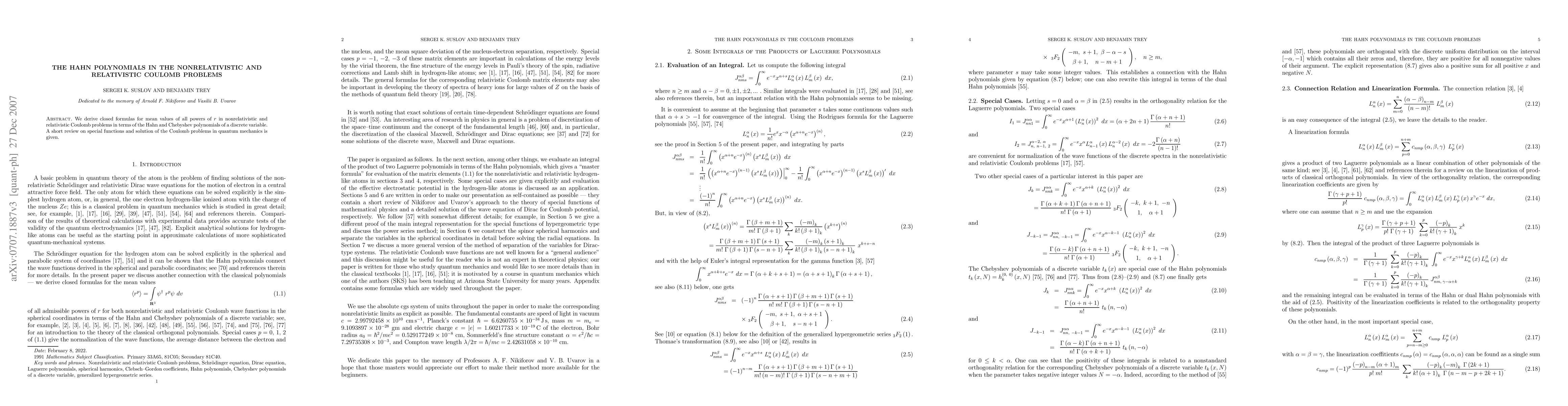 Summary: This paper derives closed formulas for mean values of powers of r in both nonrelativistic and relativistic Coulomb problems using Hahn and Chebyshev polynomials. It also provides a brief review of special functions and their application to quantum mechanical Coulomb problems.