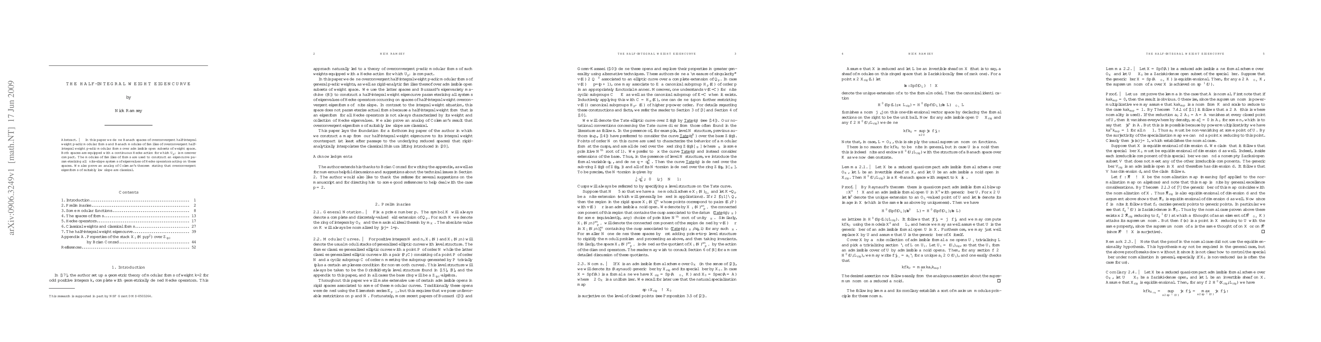 The paper defines Banach spaces for overconvergent half-integral weight $p$-adic modular forms and constructs an eigencurve for their eigenvalues, proving an analog of Coleman's theorem for these eigenforms.