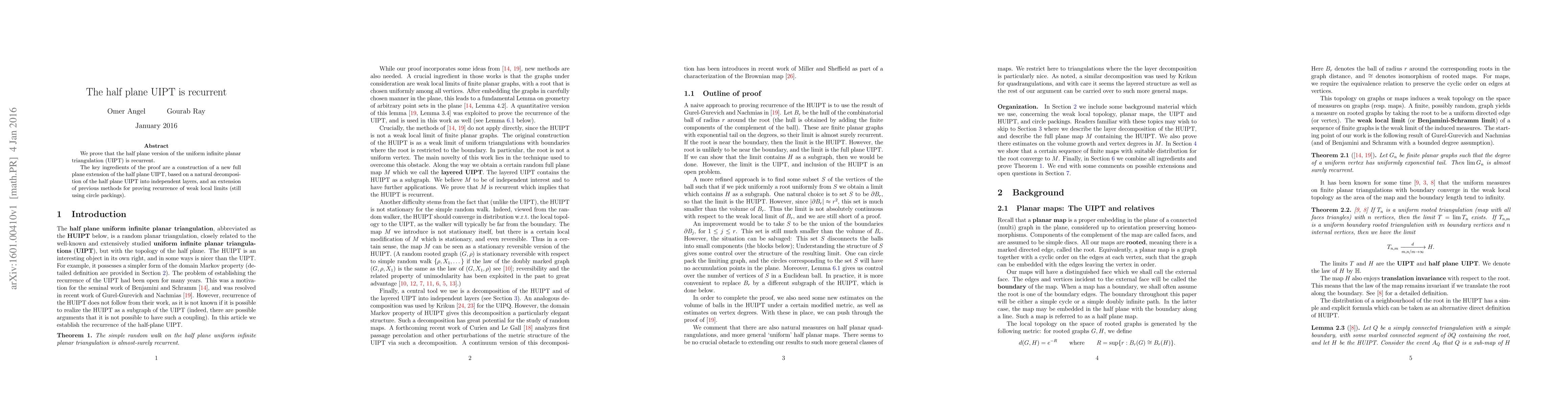 The paper proves the recurrence of the half plane version of the uniform infinite planar triangulation (UIPT) by constructing a full plane extension based on independent layers and extending previous recurrence methods for weak local limits using circle packings. This demonstrates the inherent self-similarity and recurrence properties of the UIPT in the half plane.