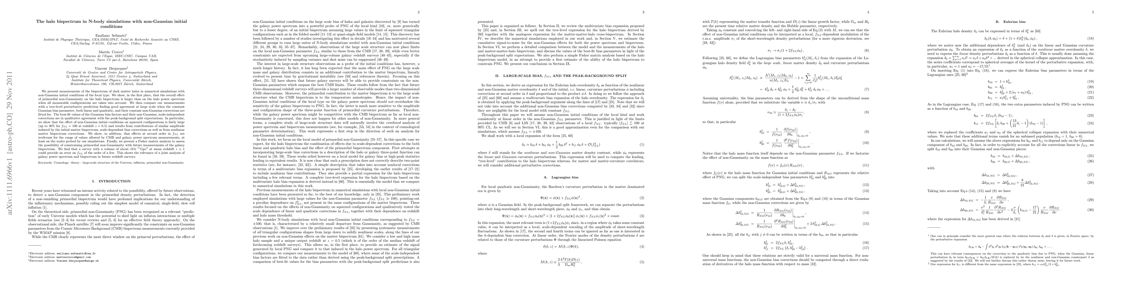 This paper measures the bispectrum of dark matter halos in simulations with non-Gaussian initial conditions, finding that non-Gaussian effects are more pronounced in the bispectrum than in the power spectrum. The study shows good agreement between measurements and perturbative predictions, highlighting significant non-Gaussian contributions to squeezed configurations.