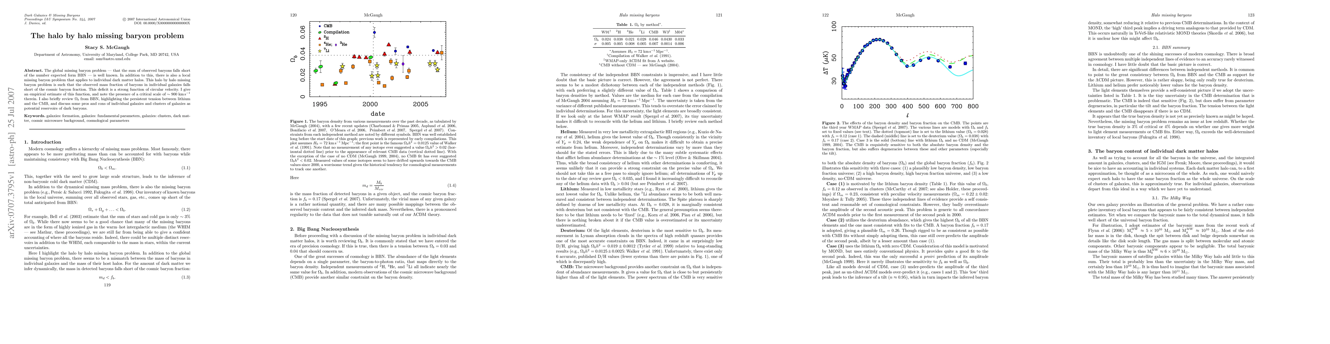 The paper addresses the "halo by halo missing baryon problem," where the observed baryon mass in individual galaxies falls short of the cosmic baryon fraction, with a notable deficit linked to circular velocity. The study also explores the broader missing baryon issue and discusses potential dark baryon reservoirs.