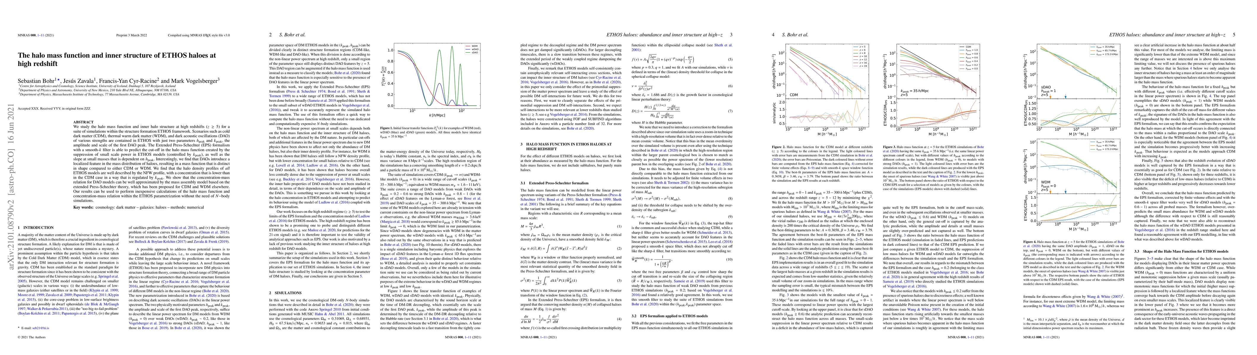 We study the halo mass function and inner halo structure at high redshifts ($z\geq5$) for a suite of simulations within the structure formation ETHOS framework. Scenarios such as cold dark matter (CDM), thermal warm dark matter (WDM), and dark acoustic oscillations (DAO) of various strengths are contained in ETHOS with just two parameters $h_{\rm peak}$ and $k_{\rm peak}$, the amplitude and scale of the first DAO peak. The Extended Press-Schechter (EPS) formalism with a smooth-$k$ filter is able to predict the cut-off in the halo mass function created by the suppression of small scale power in ETHOS models (controlled by $k_{\rm peak}$), as well as the slope at small masses that is dependent on $h_{\rm peak}$. Interestingly, we find that DAOs introduce a localized feature in the mass distribution of haloes, resulting in a mass function that is distinct in shape compared to either CDM or WDM. We find that the halo density profiles of ${\it all}$ ETHOS models are well described by the NFW profile, with a concentration that is lower than in the CDM case in a way that is regulated by $k_{\rm peak}$. We show that the concentration-mass relation for DAO models can be well approximated by the mass assembly model based on the extended Press-Schechter theory, which has been proposed for CDM and WDM elsewhere. Our results can be used to perform inexpensive calculations of the halo mass function and concentration-mass relation within the ETHOS parametrization without the need of $N-$body simulations.