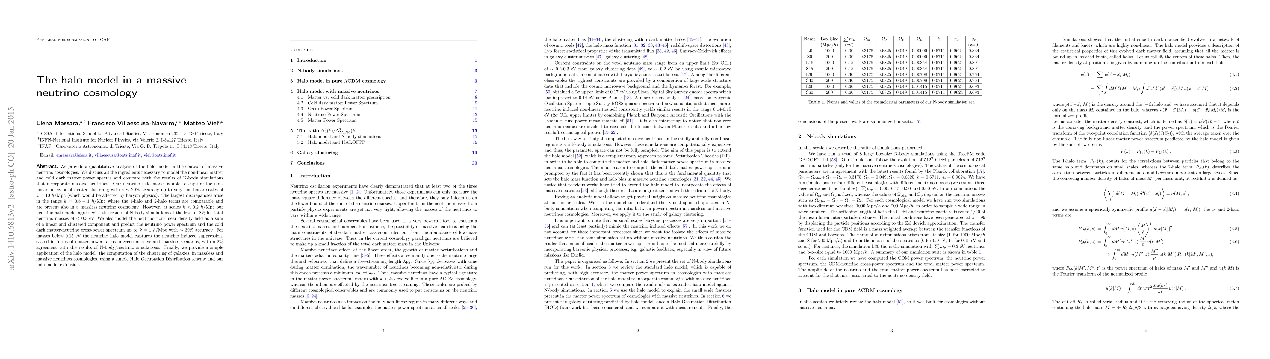 We provide a quantitative analysis of the halo model in the context of massive neutrino cosmologies. We discuss all the ingredients necessary to model the non-linear matter and cold dark matter power spectra and compare with the results of N-body simulations that incorporate massive neutrinos. Our neutrino halo model is able to capture the non-linear behavior of matter clustering with a $\sim 20\%$ accuracy up to very non-linear scales of $k=10~h/$Mpc (which would be affected by baryon physics). The largest discrepancies arise in the range $k=0.5-1~h/$Mpc where the 1-halo and 2-halo terms are comparable and are present also in a massless neutrino cosmology. However, at scales $k<0.2~h/$Mpc our neutrino halo model agrees with the results of N-body simulations at the level of 8\% for total neutrino masses of $<0.3$ eV. We also model the neutrino non-linear density field as a sum of a linear and clustered component and predict the neutrino power spectrum and the cold dark matter-neutrino cross-power spectrum up to $k=1~h/$Mpc with $\sim$ 30\% accuracy. For masses below 0.15 eV the neutrino halo model captures the neutrino induced suppression, casted in terms of matter power ratios between massive and massless scenarios, with a 2\% agreement with the results of N-body/neutrino simulations. Finally, we provide a simple application of the halo model: the computation of the clustering of galaxies, in massless and massive neutrinos cosmologies, using a simple Halo Occupation Distribution scheme and our halo model extension.