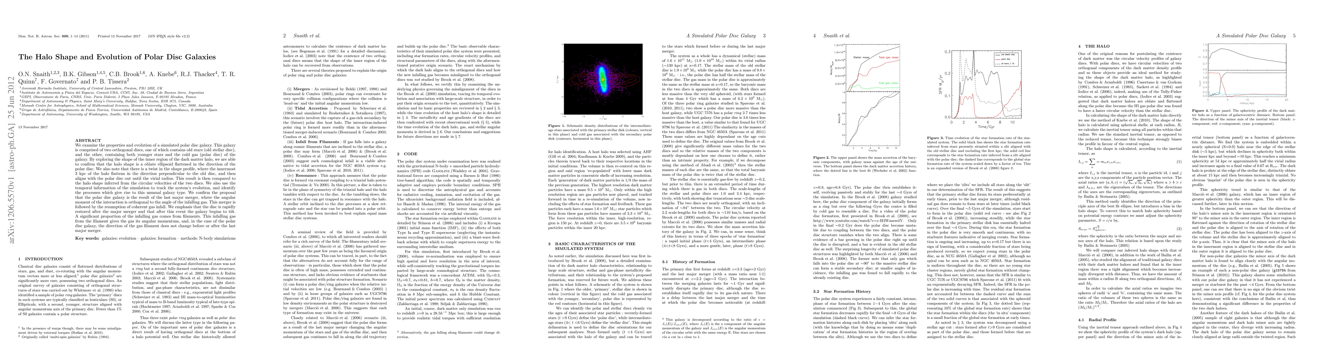 We examine the properties and evolution of a simulated polar disc galaxy. This galaxy is comprised of two orthogonal discs, one of which contains old stars (old stellar disc), and the other, containing both younger stars and the cold gas (polar disc) of the galaxy. By exploring the shape of the inner region of the dark matter halo, we are able to confirm that the halo shape is a oblate ellipsoid flattened in the direction of the polar disc. We also note that there is a twist in the shape profile, where the innermost 3 kpc of the halo flattens in the direction perpendicular to the old disc, and then aligns with the polar disc out until the virial radius. This result is then compared to the halo shape inferred from the circular velocities of the two discs. We also use the temporal information of the simulation to track the system's evolution, and identify the processes which give rise to this unusual galaxy type. We confirm the proposal that the polar disc galaxy is the result of the last major merger, where the angular moment of the interaction is orthogonal to the angle of the infalling gas. This merger is followed by the resumption of coherent gas infall. We emphasise that the disc is rapidly restored after the major merger and that after this event the galaxy begins to tilt. A significant proportion of the infalling gas comes from filaments. This infalling gas from the filament gives the gas its angular momentum, and, in the case of the polar disc galaxy, the direction of the gas filament does not change before or after the last major merger.