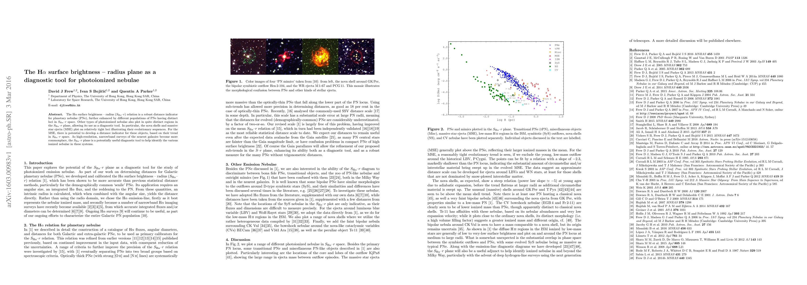 The H$\alpha$ surface brightness $-$ radius ($S-r$) relation is a robust distance indicator for planetary nebulae (PNe), further enhanced by different populations of PNe having distinct loci in $S-r$ space. Other types of photoionized nebulae also plot in quite distinct regions in the $S-r$ plane, allowing its use as a diagnostic tool. In particular, the nova shells and massive star ejecta (MSE) plot on relatively tight loci illustrating their evolutionary sequences. For the MSE, there is potential to develop a distance indicator for these objects, based on their trend in $S-r$ space. As high-resolution, narrowband surveys of the nearest galaxies become more commonplace, the $S-r$ plane is a potentially useful diagnostic tool to help identify the various ionized nebulae in these systems.