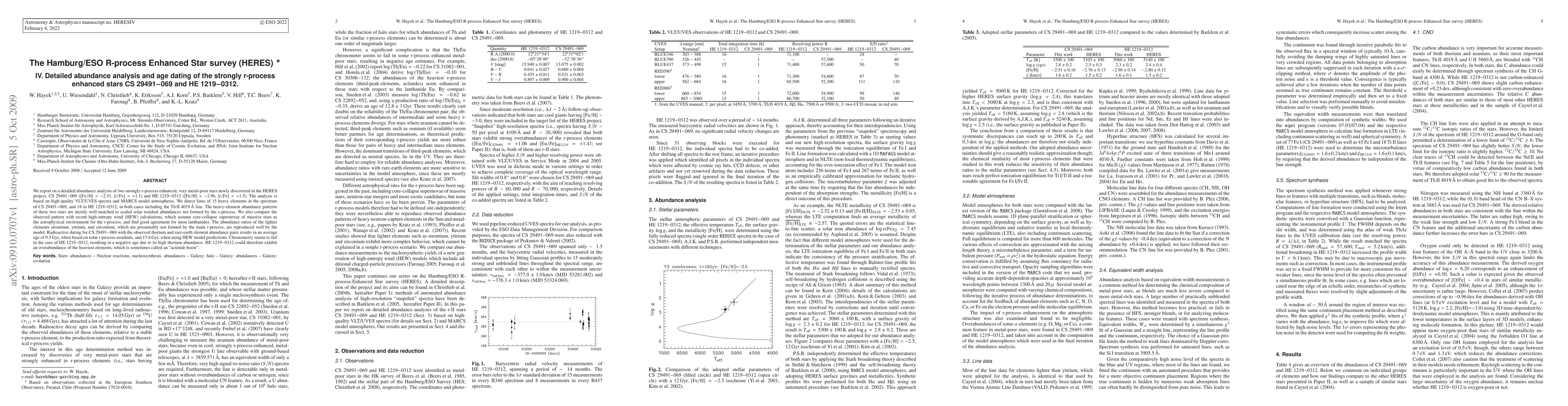 We report on a detailed abundance analysis of two strongly r-process enhanced, very metal-poor stars newly discovered in the HERES project, CS 29491-069 ([Fe/H]=-2.51, [r/Fe]=+1.1) and HE 1219-0312 ([Fe/H]=-2.96, [r/Fe]=+1.5). The analysis is based on high-quality VLT/UVES spectra and MARCS model atmospheres. We detect lines of 15 heavy elements in the spectrum of CS 29491-069, and 18 in HE 1219-0312; in both cases including the Th II 4019 {\AA} line. The heavy-element abundance patterns of these two stars are mostly well-matched to scaled solar residual abundances not formed by the s-process. We also compare the observed pattern with recent high-entropy wind (HEW) calculations, which assume core-collapse supernovae of massive stars as the astrophysical environment for the r-process, and find good agreement for most lanthanides. The abundance ratios of the lighter elements strontium, yttrium, and zirconium, which are presumably not formed by the main r-process, are reproduced well by the model. Radioactive dating for CS 29491-069 with the observed thorium and rare-earth element abundance pairs results in an average age of 9.5 Gyr, when based on solar r-process residuals, and 17.6 Gyr, when using HEW model predictions. Chronometry seems to fail in the case of HE 1219-0312, resulting in a negative age due to its high thorium abundance. HE 1219-0312 could therefore exhibit an overabundance of the heaviest elements, which is sometimes called an "actinide boost".
