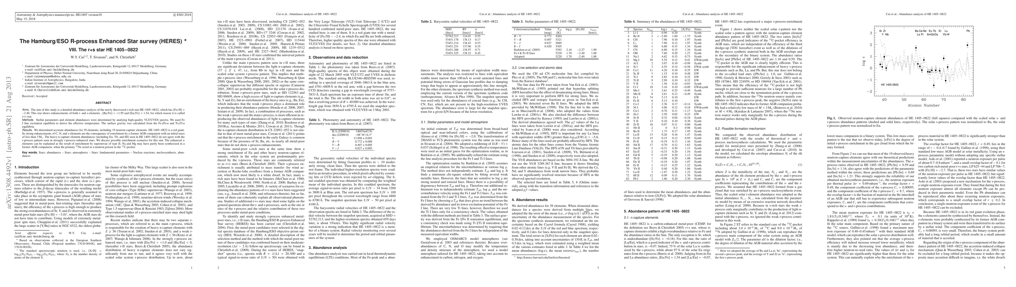 This study provides a detailed abundance analysis of the r+s star HE 1405 0822, revealing significant enhancements of both r- and s-elements. The star's heavy neutron-capture elements do not fit typical r-process patterns, suggesting complex enrichment scenarios involving a former low-mass AGB companion and type II supernovae.