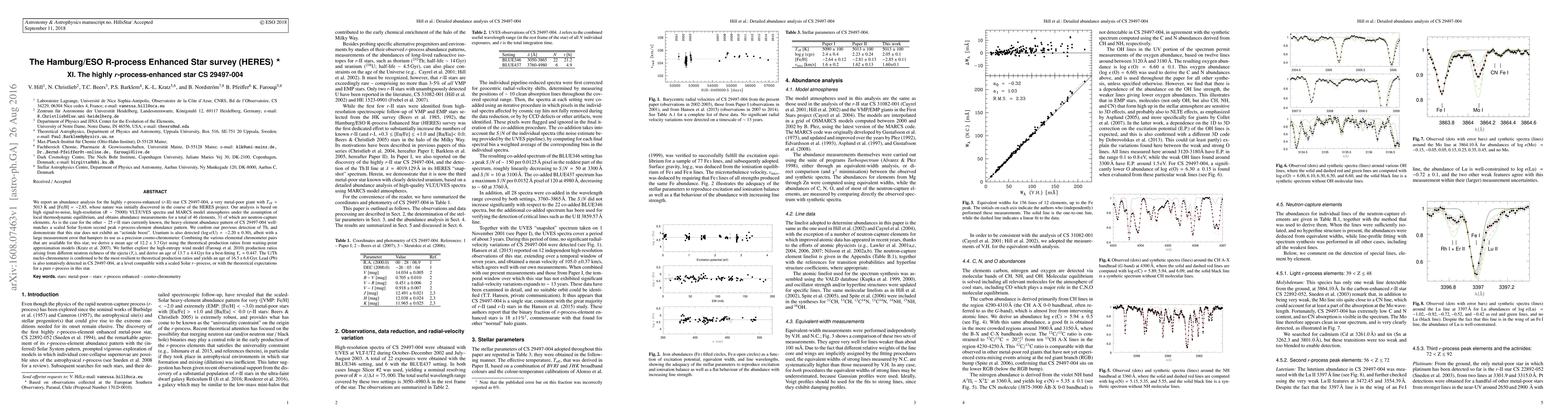 We report an abundance analysis for the highly r-process-enhanced (r-II) star CS 29497-004, a very metal-poor giant with Teff = 5013K and [Fe/H]=-2.85, whose nature was initially discovered in the course of the HERES project. Our analysis is based on high signal-to-noise, high-resolution (R~75000) VLT/UVES spectra and MARCS model atmospheres under the assumption of local thermodynamic equilibrium, and obtains abundance measurements for a total of 46 elements, 31 of which are neutron-capture elements. As is the case for the other 25 r-II stars currently known, the heavy-element abundance pattern of CS 29497-004 well-matches a scaled Solar System second peak r-process-element abundance pattern. We confirm our previous detection of Th, and demonstrate that this star does not exhibit an "actinide boost". Uranium is also detected (log e(U) =-2.20+/-0.30), albeit with a large measurement error that hampers its use as a precision cosmo-chronometer. Combining the various elemental chronometer pairs that are available for this star, we derive a mean age of 12.2+/-3.7 Gyr using the theoretical production ratios from waiting-point approximation models (Kratz et al. 2007). We further explore the high-entropy wind model (Farouqi et al. 2010) production ratios arising from different neutron richness of the ejecta (Y_e), and derive an age of 13.7+/-4.4 Gyr for a best-fitting Y_e=0.447. The U/Th nuclei-chronometer is confirmed to be the most resilient to theoretical production ratios and yields an age of 16.5+:-6.6 Gyr. Lead (Pb) is also tentatively detected in CS 29497-004, at a level compatible with a scaled Solar r-process, or with the theoretical expectations for a pure r-process in this star.