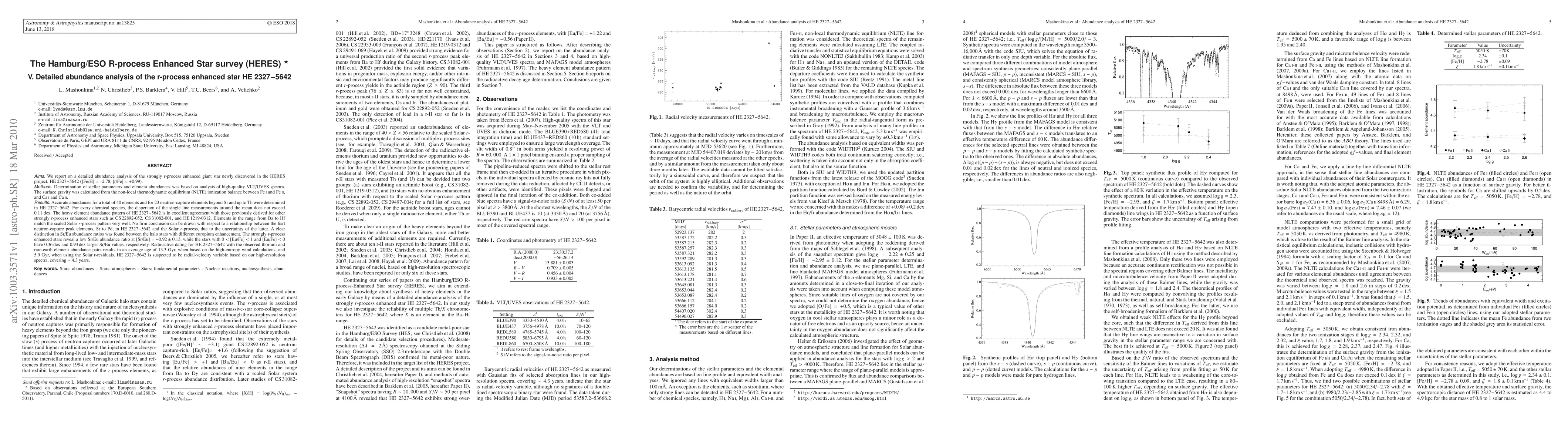 The research utilized high-quality VLT/UVES spectra for a detailed abundance analysis of the strongly r-process enhanced giant star HE 2327-5642, determining stellar parameters and element abundances based on high-resolution spectra and NLTE ionization balance calculations.