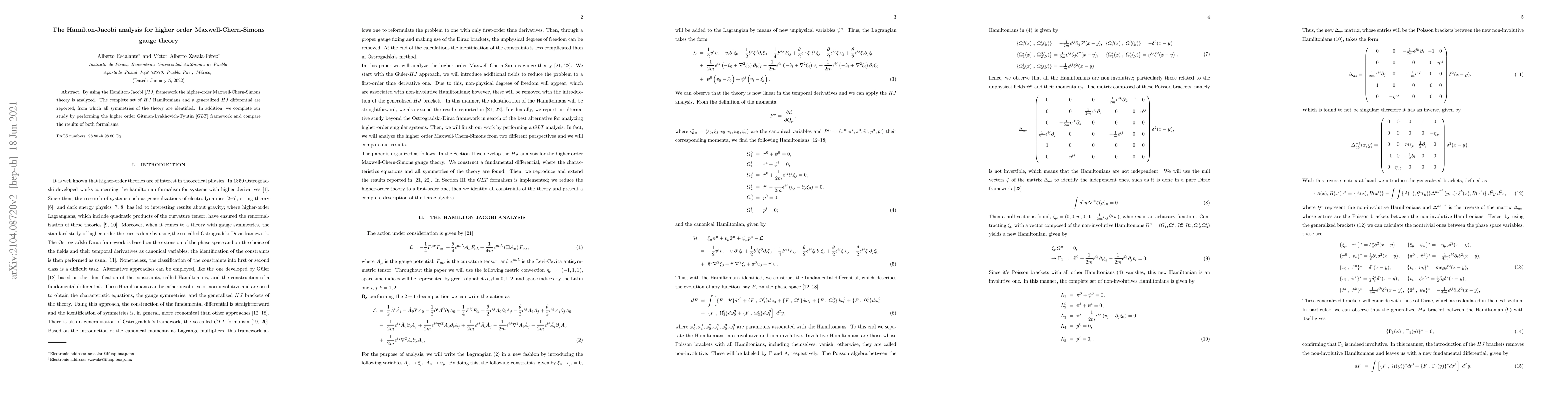 By using the Hamilton-Jacobi [$HJ$] framework the higher-order Maxwell-Chern-Simons theory is analyzed. The complete set of $HJ$ Hamiltonians and a generalized $HJ$ differential are reported, from which all symmetries of the theory are identified. In addition, we complete our study by performing the higher order Gitman-Lyakhovich-Tyutin [$GLT$] framework and compare the results of both formalisms.