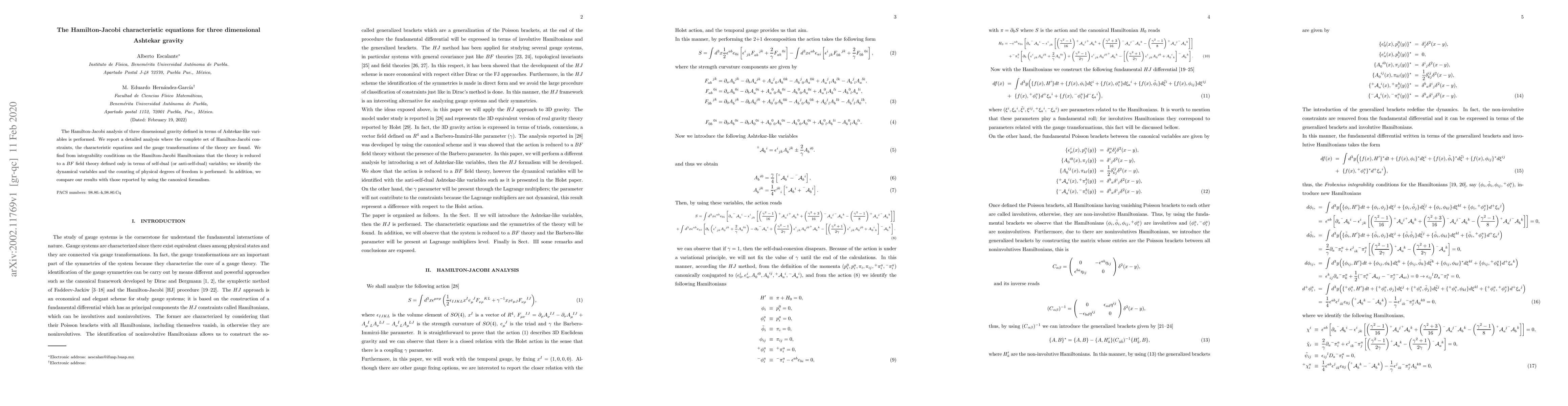 This paper conducts a Hamilton-Jacobi analysis of three-dimensional gravity using Ashtekar-like variables, identifying the complete set of constraints and gauge transformations. The study reveals that the theory reduces to a BF field theory in self-dual variables, and provides a count of physical degrees of freedom, comparing its results with those from the canonical formalism.