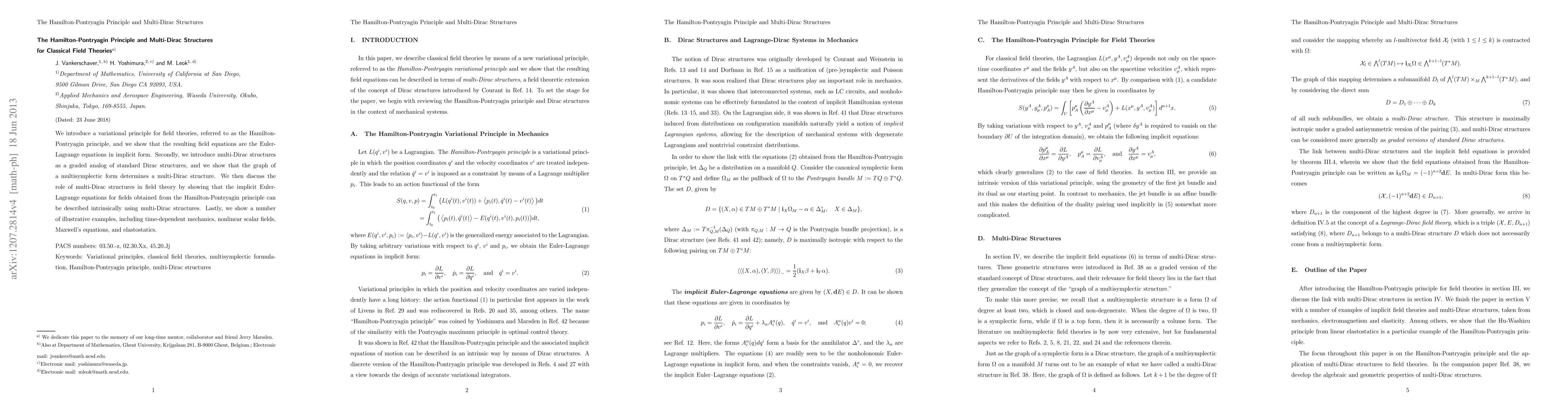 This paper presents a Hamilton-Pontryagin principle for field theories, deriving implicit Euler-Lagrange equations from it. It introduces multi-Dirac structures, demonstrating their intrinsic role in describing these equations, and provides examples from various classical field theories.