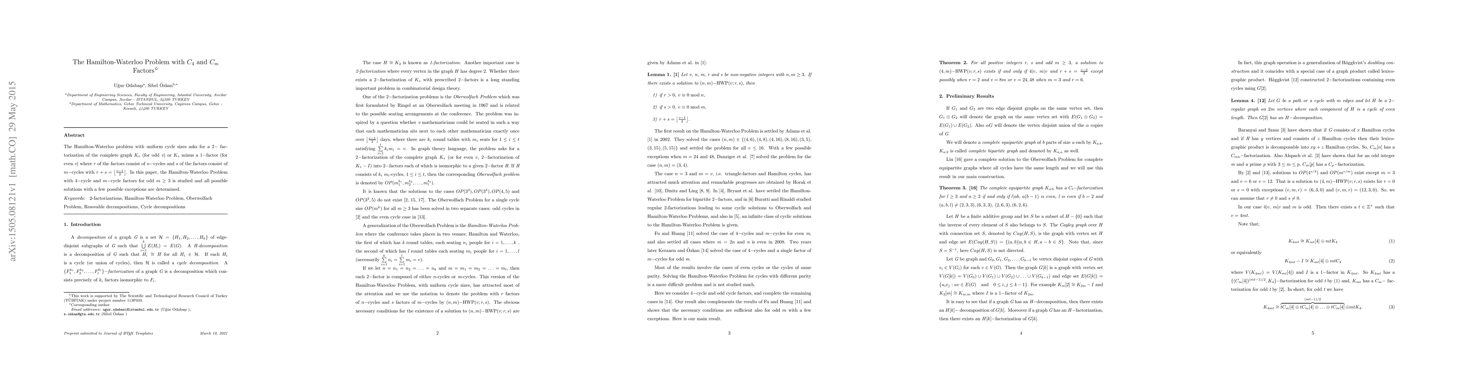 The Hamilton-Waterloo problem with uniform cycle sizes asks for a $2-$ factorization of the complete graph $K_v$ (for odd {\em v}) or $K_v$ minus a $1-$factor (for even {\em v}) where $r$ of the factors consist of $n-$cycles and $s$ of the factors consist of $m-$cycles with $r+s=\left \lfloor \frac{v-1}{2} \right \rfloor$. In this paper, the Hamilton-Waterloo Problem with $4-$cycle and $m-$cycle factors for odd $m\geq 3$ is studied and all possible solutions with a few possible exceptions are determined.