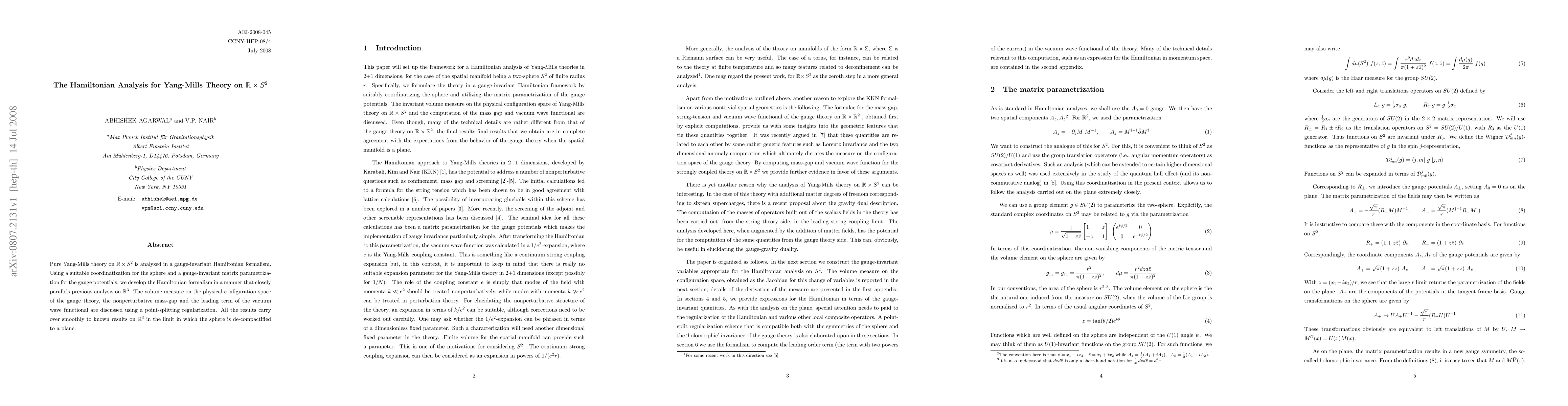 This paper develops a gauge-invariant Hamiltonian formalism for pure Yang-Mills theory on $R \times S^2$ and parallels the analysis of $R^3$. It discusses the volume measure, nonperturbative mass-gap, and vacuum wave functional, showing consistency with $R^3$ results when the sphere is de-compactified.