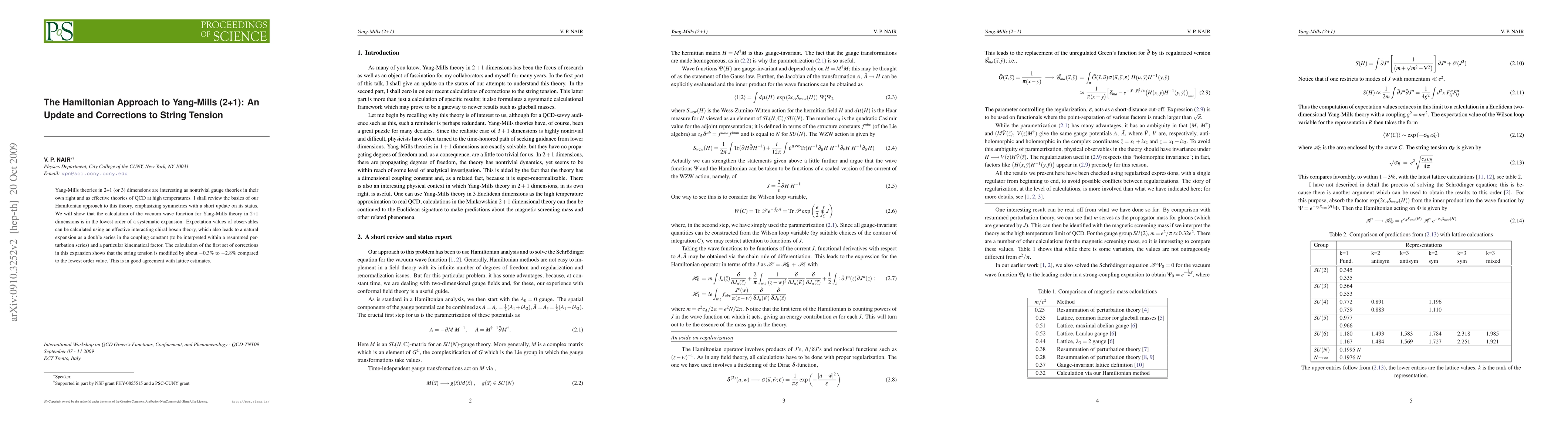 This paper reviews the Hamiltonian approach to Yang-Mills theory in 2+1 dimensions, highlighting its symmetries and computational methods. It calculates the first set of corrections to the string tension, showing a modification of -0.3% to -2.8%, aligning well with lattice estimates.