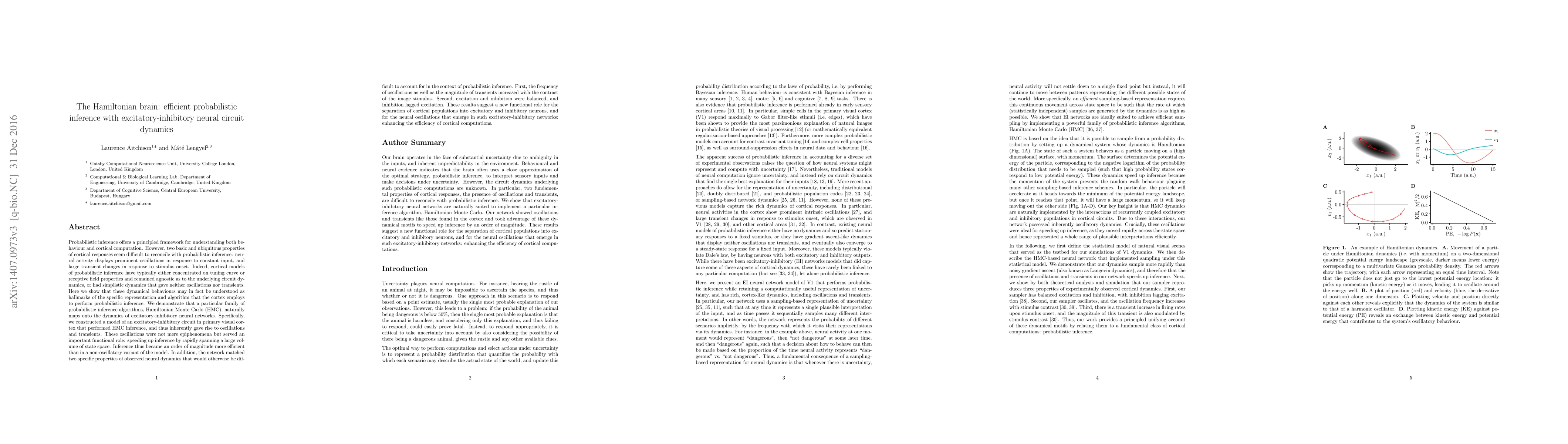This paper demonstrates that excitatory-inhibitory neural circuits in the cortex perform efficient probabilistic inference using Hamiltonian Monte Carlo (HMC) algorithms, which naturally produce oscillations and transients. These dynamics enhance inference speed by rapidly exploring state space, aligning with observed neural behaviors and suggesting a functional role for neural oscillations and the balance of excitation and inhibition.