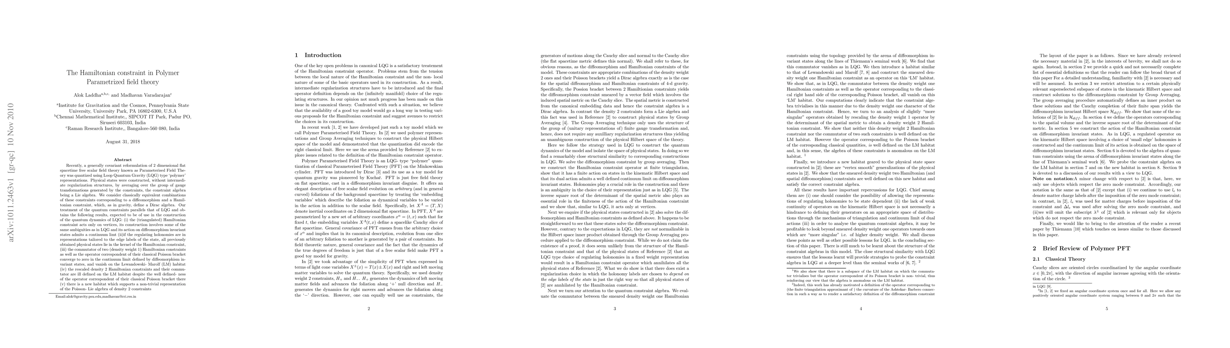 Recently, a generally covariant reformulation of 2 dimensional flat spacetime free scalar field theory known as Parameterised Field Theory was quantized using Loop Quantum Gravity (LQG) type `polymer' representations. Physical states were constructed, without intermediate regularization structures, by averaging over the group of gauge transformations generated by the constraints, the constraint algebra being a Lie algebra. We consider classically equivalent combinations of these constraints corresponding to a diffeomorphism and a Hamiltonian constraint, which, as in gravity, define a Dirac algebra. Our treatment of the quantum constraints parallels that of LQG and obtains the following results, expected to be of use in the construction of the quantum dynamics of LQG:(i) the (triangulated) Hamiltonian constraint acts only on vertices, its construction involves some of the same ambiguities as in LQG and its action on diffeomorphism invariant states admits a continuum limit (ii)if the regulating holonomies are in representations tailored to the edge labels of the state, all previously obtained physical states lie in the kernel of the Hamiltonian constraint, (iii) the commutator of two (density weight 1) Hamiltonian constraints as well as the operator correspondent of their classical Poisson bracket converge to zero in the continuum limit defined by diffeomorphism invariant states, and vanish on the Lewandowski- Marolf (LM) habitat (iv) the rescaled density 2 Hamiltonian constraints and their commutator are ill defined on the LM habitat despite the well defined- ness of the operator correspondent of their classical Poisson bracket there (v) there is a new habitat which supports a non-trivial representation of the Poisson- Lie algebra of density 2 constraints