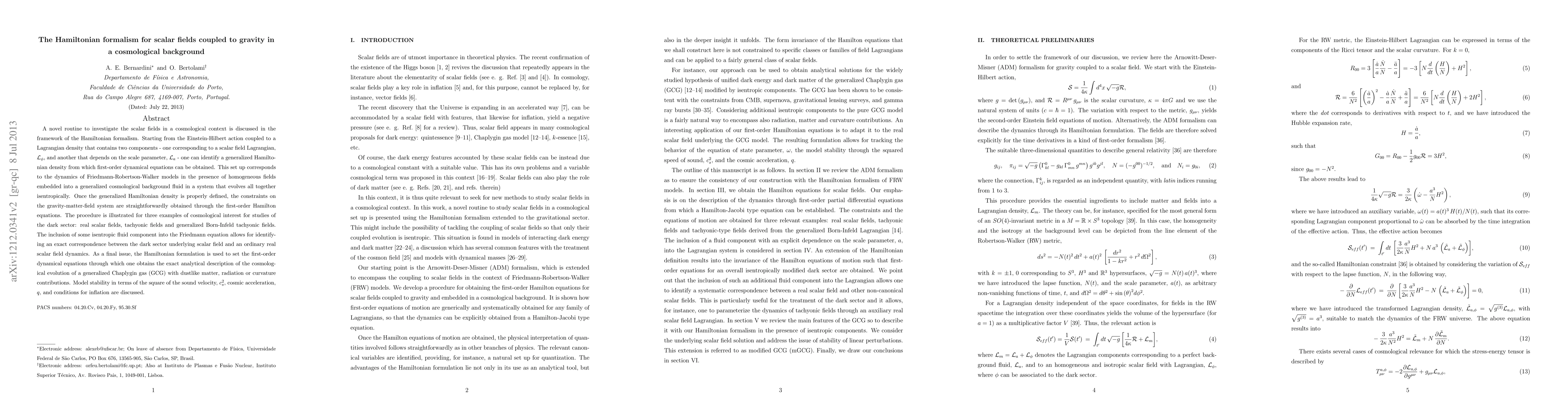 A novel routine to investigate the scalar fields in a cosmological context is discussed in the framework of the Hamiltonian formalism. Starting from the Einstein-Hilbert action coupled to a Lagrangian density that contains two components - one corresponding to a scalar field Lagrangian, ${\mathcal{L}}_{\phi}$, and another that depends on the scale parameter, ${\mathcal{L}}_{a}$ - one can identify a generalized Hamiltonian density from which first-order dynamical equations can be obtained. This set up corresponds to the dynamics of Friedmann-Robertson-Walker models in the presence of homogeneous fields embedded into a generalized cosmological background fluid in a system that evolves all together isentropically. Once the generalized Hamiltonian density is properly defined, the constraints on the gravity-matter-field system are straightforwardly obtained through the first-order Hamilton equations. The procedure is illustrated for three examples of cosmological interest for studies of the dark sector: real scalar fields, tachyonic fields and generalized Born-Infeld tachyonic fields. The inclusion of some isentropic fluid component into the Friedmann equation allows for identifying an exact correspondence between the dark sector underlying scalar field and an ordinary real scalar field dynamics. As a final issue, the Hamiltonian formulation is used to set the first-order dynamical equations through which one obtains the exact analytical description of the cosmological evolution of a generalized Chaplygin gas (GCG) with dustlike matter, radiation or curvature contributions. Model stability in terms of the square of the sound velocity, $c_{s}^{2}$, cosmic acceleration, $q$, and conditions for inflation are discussed.