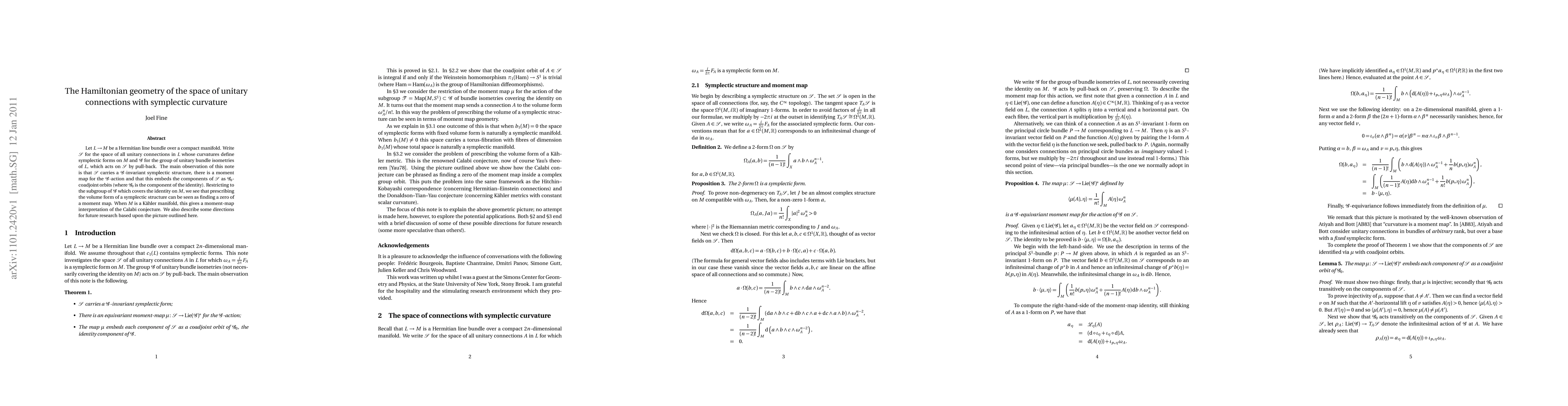 This paper explores the Hamiltonian geometry of the space of unitary connections in a Hermitian line bundle over a compact manifold, showing that it carries a G-invariant symplectic structure and relates this to the Calabi conjecture when M is Kähler. Future research directions are also proposed based on this framework.