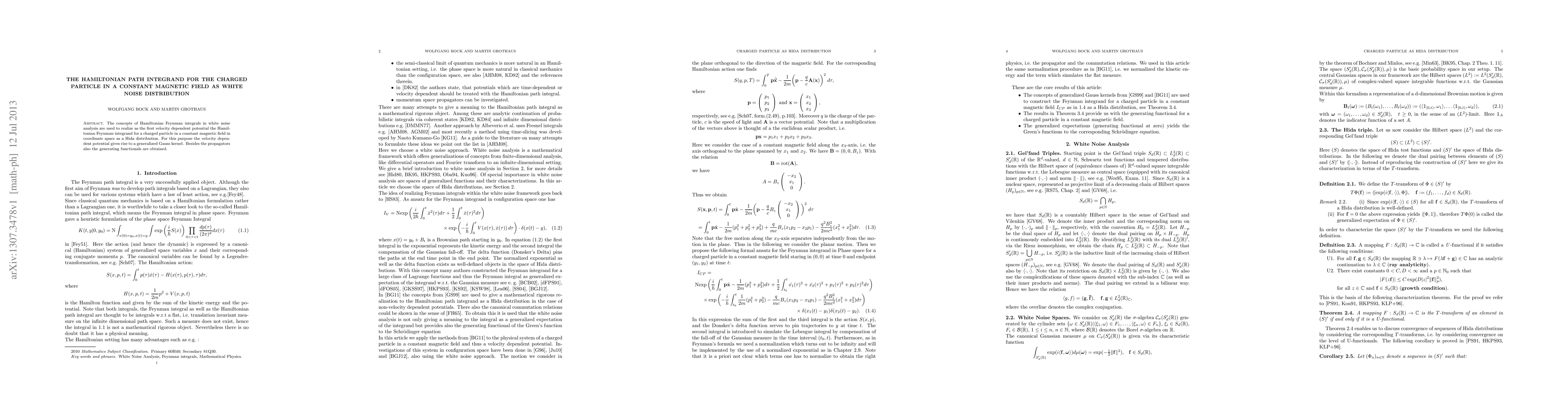 This paper develops the Hamiltonian Feynman integrand for a charged particle in a constant magnetic field, representing it as a Hida distribution in white noise analysis. It also derives the generalized Gauss kernel and generating functionals associated with the velocity-dependent potential.