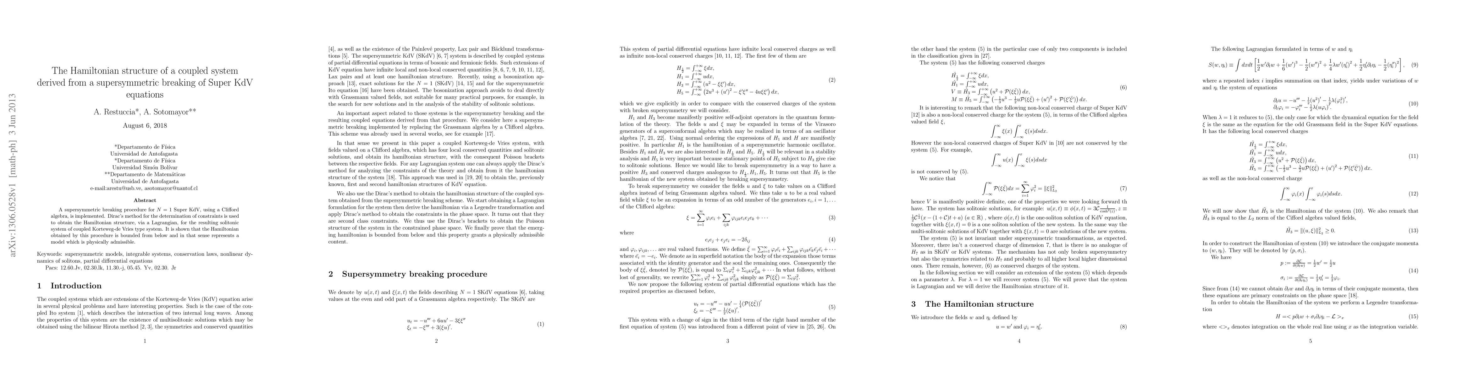 A supersymmetric breaking procedure for $N=1$ Super KdV, using a Clifford algebra, is implemented. Dirac's method for the determination of constraints is used to obtain the Hamiltonian structure, via a Lagrangian, for the resulting solitonic system of coupled Korteweg-de Vries type system. It is shown that the Hamiltonian obtained by this procedure is bounded from below and in that sense represents a model which is physically admissible.