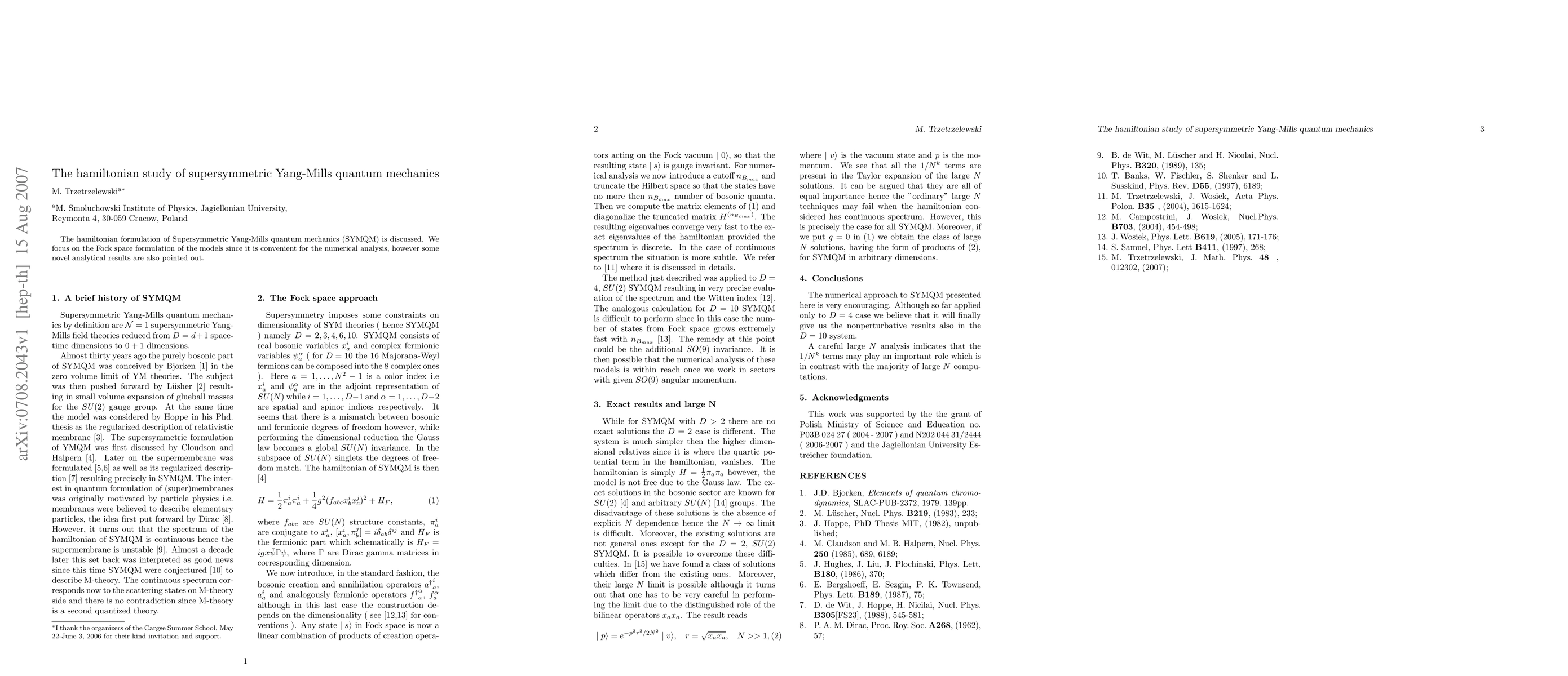 This paper explores the Hamiltonian formulation of Supersymmetric Yang-Mills quantum mechanics (SYMQM) using the Fock space approach, emphasizing its utility for numerical analysis while also presenting some new analytical findings.