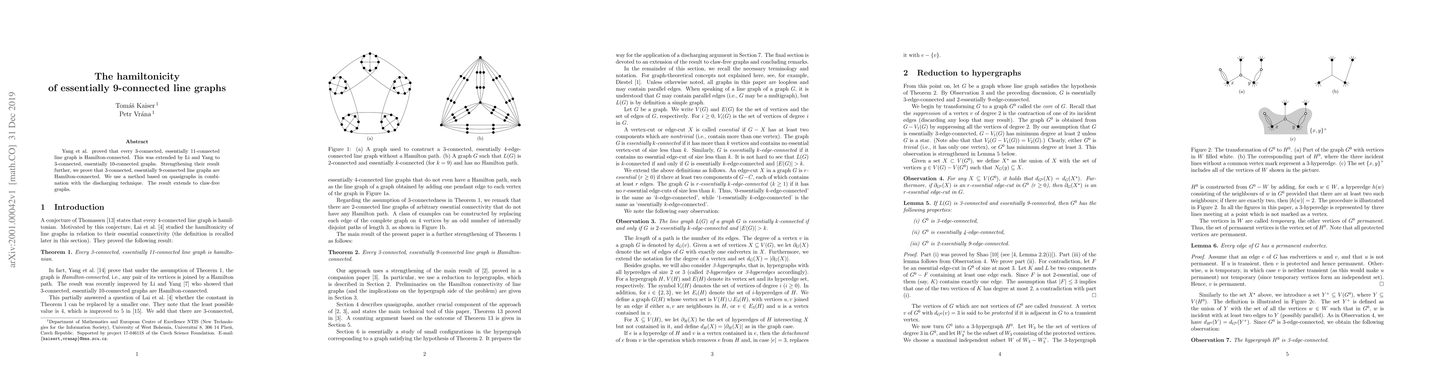 This paper proves that every 3-connected, essentially 9-connected line graph is Hamilton-connected, extending previous results on higher connectivity. The proof employs quasigraphs and the discharging technique, and the result also applies to claw-free graphs.