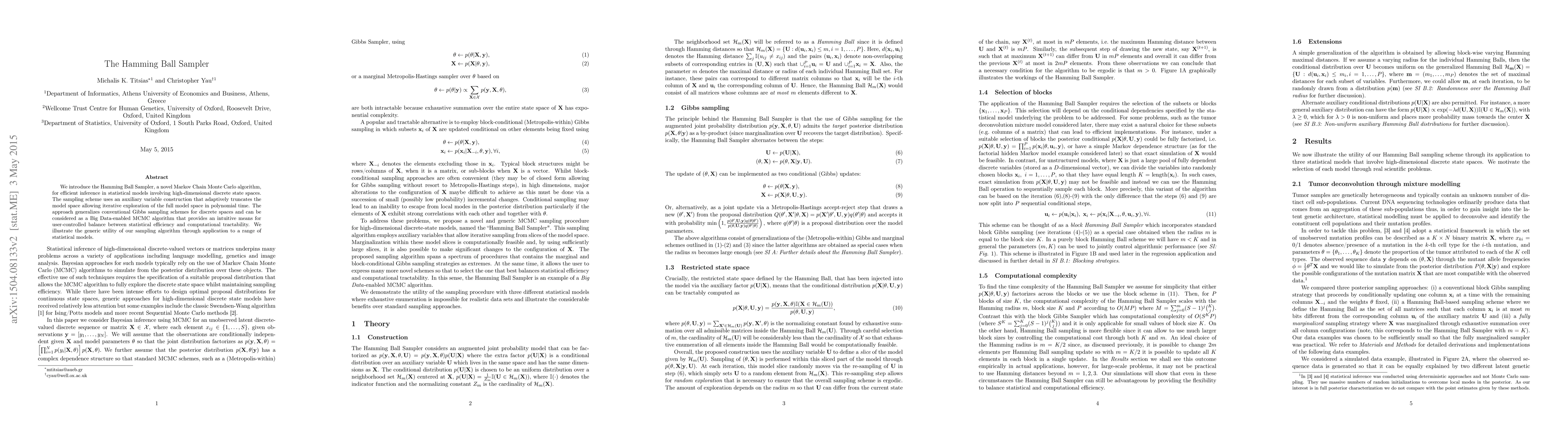 The Hamming Ball Sampler is a new MCMC algorithm designed for efficient inference in high-dimensional discrete state spaces, utilizing an adaptive truncation method for polynomial-time exploration. It offers a balance between statistical efficiency and computational feasibility, generalizing conventional Gibbs sampling.