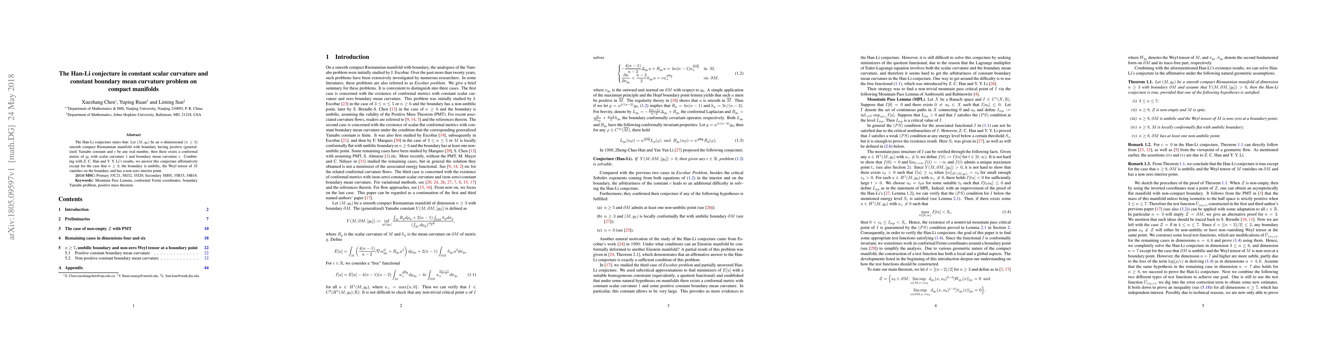Summary: The Han-Li conjecture posits the existence of a conformal metric on a compact Riemannian manifold with boundary, achieving scalar curvature of 1 and specified boundary mean curvature. The conjecture is confirmed for most cases except when the manifold's dimensions are 8 or higher, the boundary is umbilic, and the Weyl tensor has specific properties.
