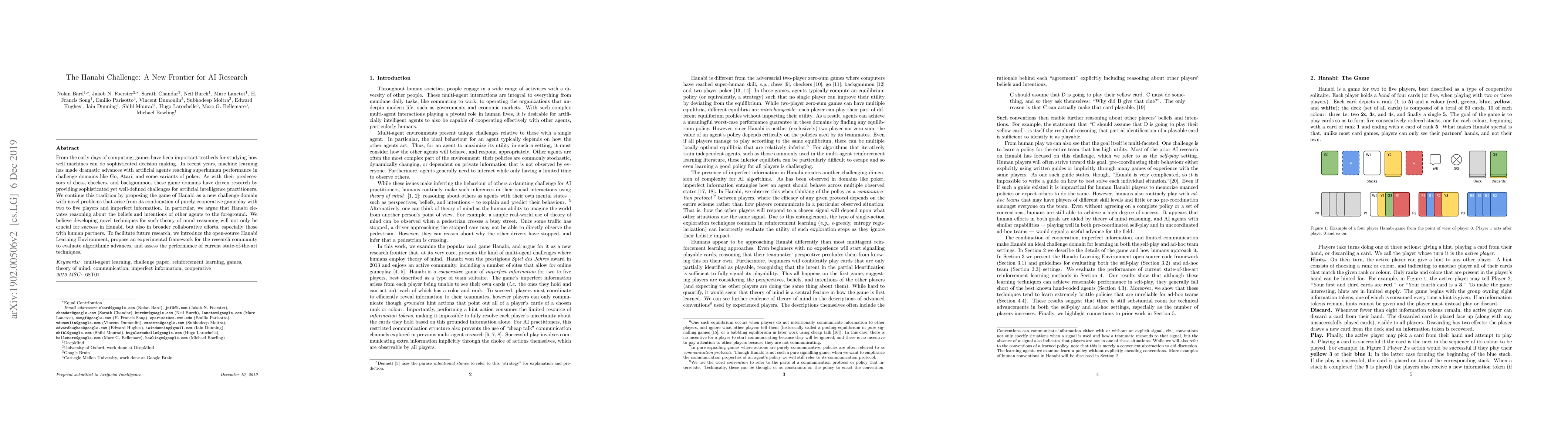 This paper proposes the cooperative game Hanabi as a new AI research challenge, emphasizing its unique problems involving theory of mind reasoning among players. The authors introduce an open-source Hanabi Learning Environment and an experimental framework to evaluate AI techniques, aiming to advance collaborative AI, especially in human-AI interactions.
