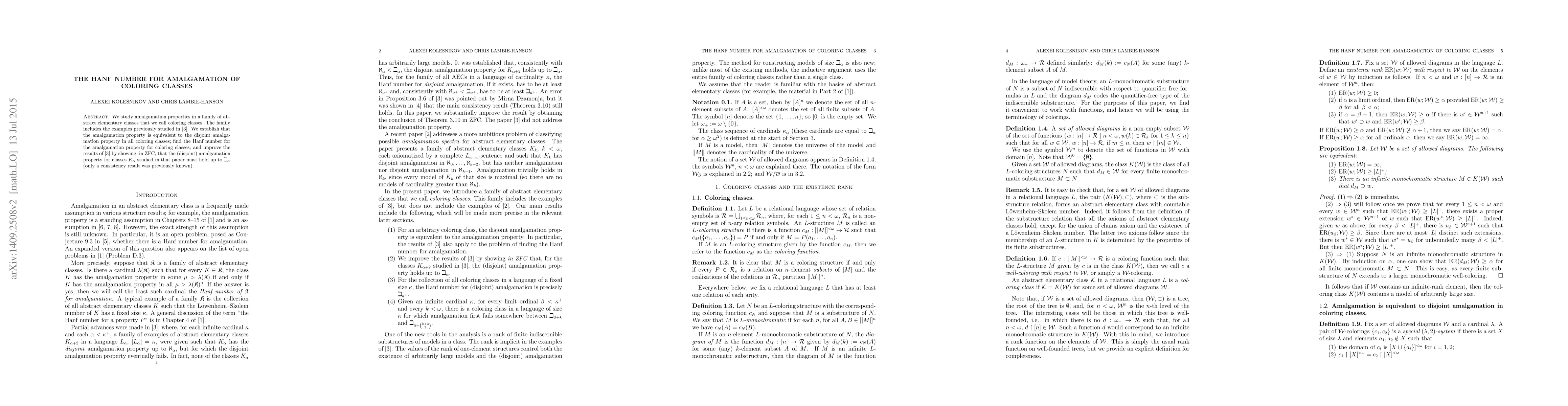 This paper investigates amalgamation properties in coloring classes, establishing that the amalgamation property is equivalent to the disjoint amalgamation property. It determines the Hanf number for the amalgamation property and enhances prior results by proving, in ZFC, that the (disjoint) amalgamation property holds up to $\beth_\alpha$ for classes $K_\alpha$.