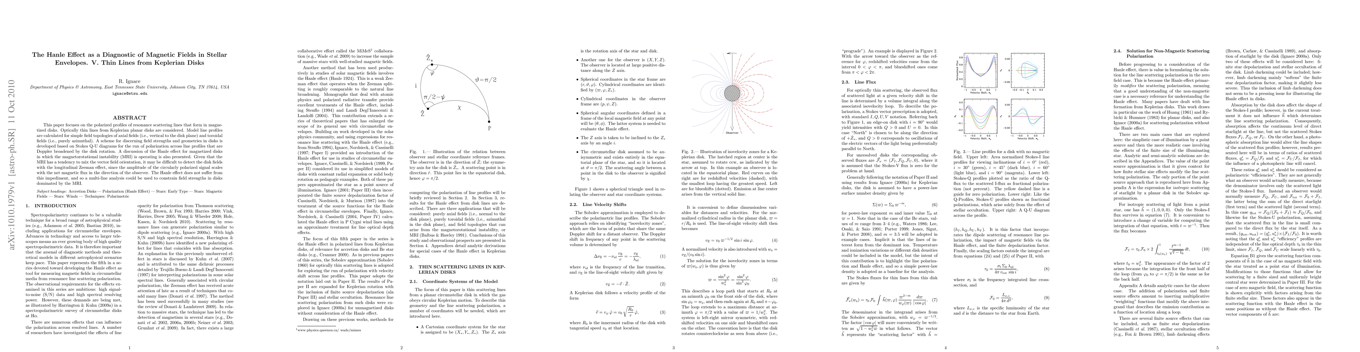 This paper investigates the Hanle effect in optically thin lines from Keplerian disks, developing a method to determine magnetic field strengths and geometries using polarized line profiles. It highlights the Hanle effect's advantage over the longitudinal Zeeman effect in detecting fields in disks influenced by the magnetorotational instability.