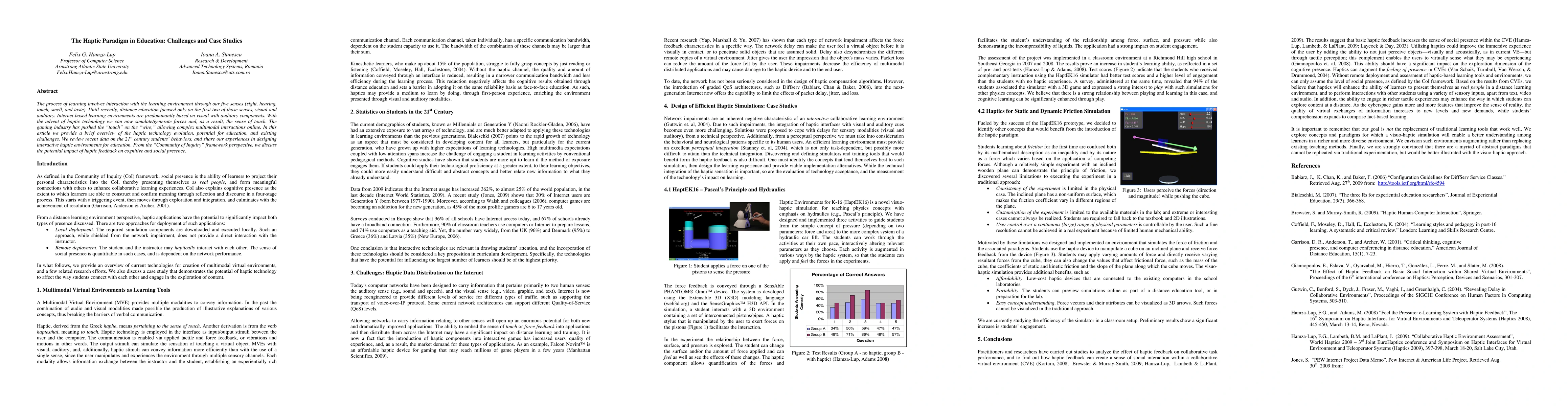The paper provides an overview of haptic technology in education, discussing its evolution, potential, and challenges. It reviews student behaviors, shares experiences in designing haptic environments, and examines the impact of haptic feedback on cognitive and social presence from the Community of Inquiry framework perspective.