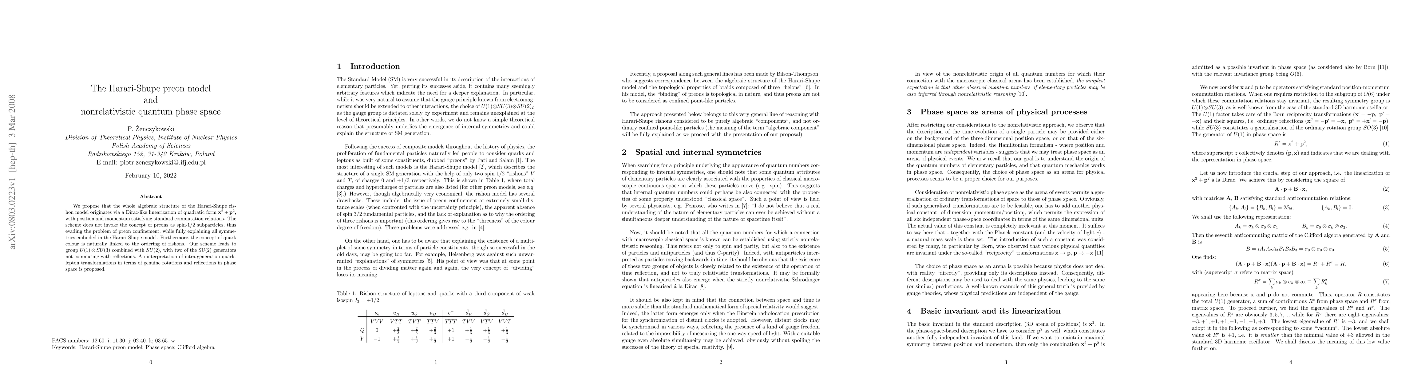 We propose that the whole algebraic structure of the Harari-Shupe rishon model originates via a Dirac-like linearization of quadratic form x^2+p^2, with position and momentum satisfying standard commutation relations. The scheme does not invoke the concept of preons as spin-1/2 subparticles, thus evading the problem of preon confinement, while fully explaining all symmetries emboded in the Harari-Shupe model. Furthermore, the concept of quark colour is naturally linked to the ordering of rishons. Our scheme leads to group U(1)xSU(3) combined with SU(2), with two of the SU(2) generators not commuting with reflections. An interpretation of intra-generation quark-lepton transformations in terms of genuine rotations and reflections in phase space is proposed.