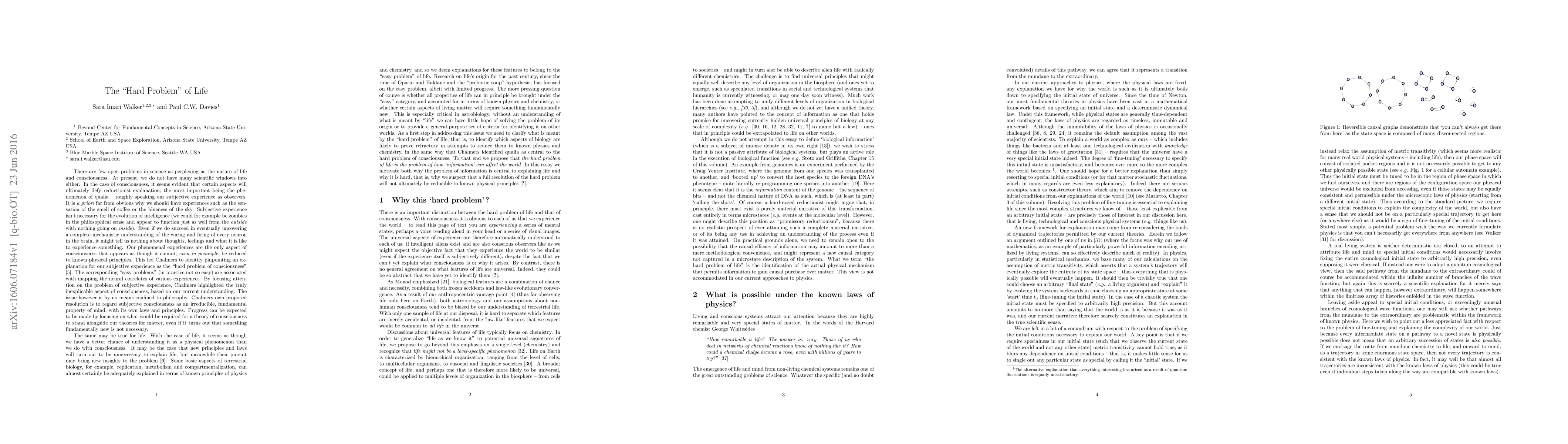 This paper proposes the concept of a "hard problem of life", identifying how information affects the world as a central challenge to explaining life. It suggests that resolving this problem may require new physical laws or principles, similar to addressing the hard problem of consciousness.