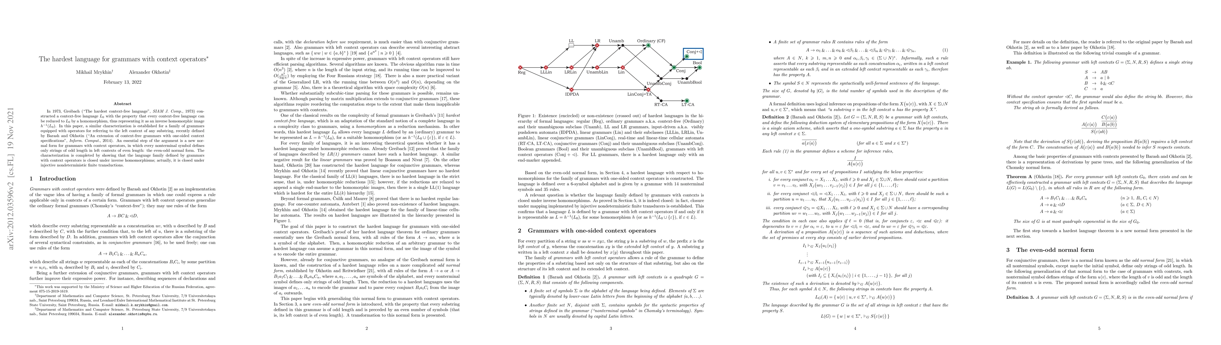 This paper establishes the hardest language for grammars with context operators, analogous to Greibach's result for context-free grammars. It introduces an even-odd normal form and proves the closure of this language family under inverse homomorphisms and injective nondeterministic finite transductions.