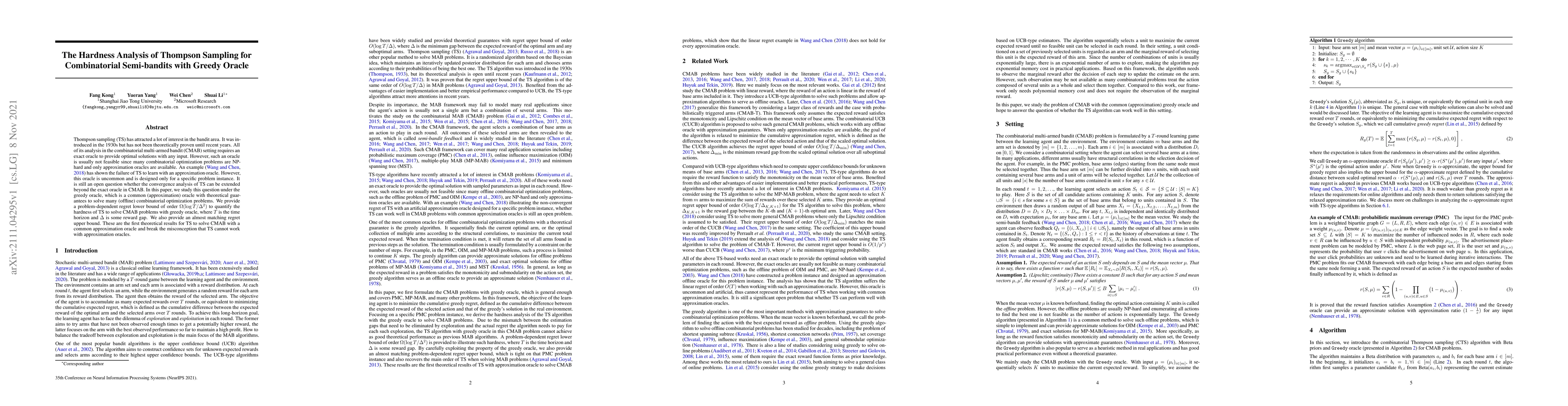 This paper studies Thompson sampling for combinatorial semi-bandits with a greedy oracle, establishing a problem-dependent regret lower bound of $rac{ ext{log} T}{ ext{Δ}^2}$ and an almost matching upper bound, providing the first theoretical results on TS with a common approximation oracle.