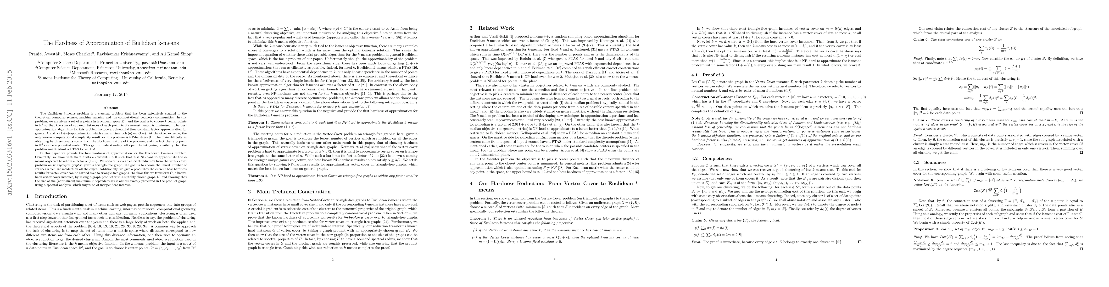 This paper establishes the first hardness of approximation for the Euclidean $k$-means problem, proving that it is NP-hard to approximate the objective within any constant factor $(1+\epsilon)$. The authors achieve this through a reduction from the vertex cover problem on triangle-free graphs, leveraging spectral analysis to preserve the structure of hard instances.